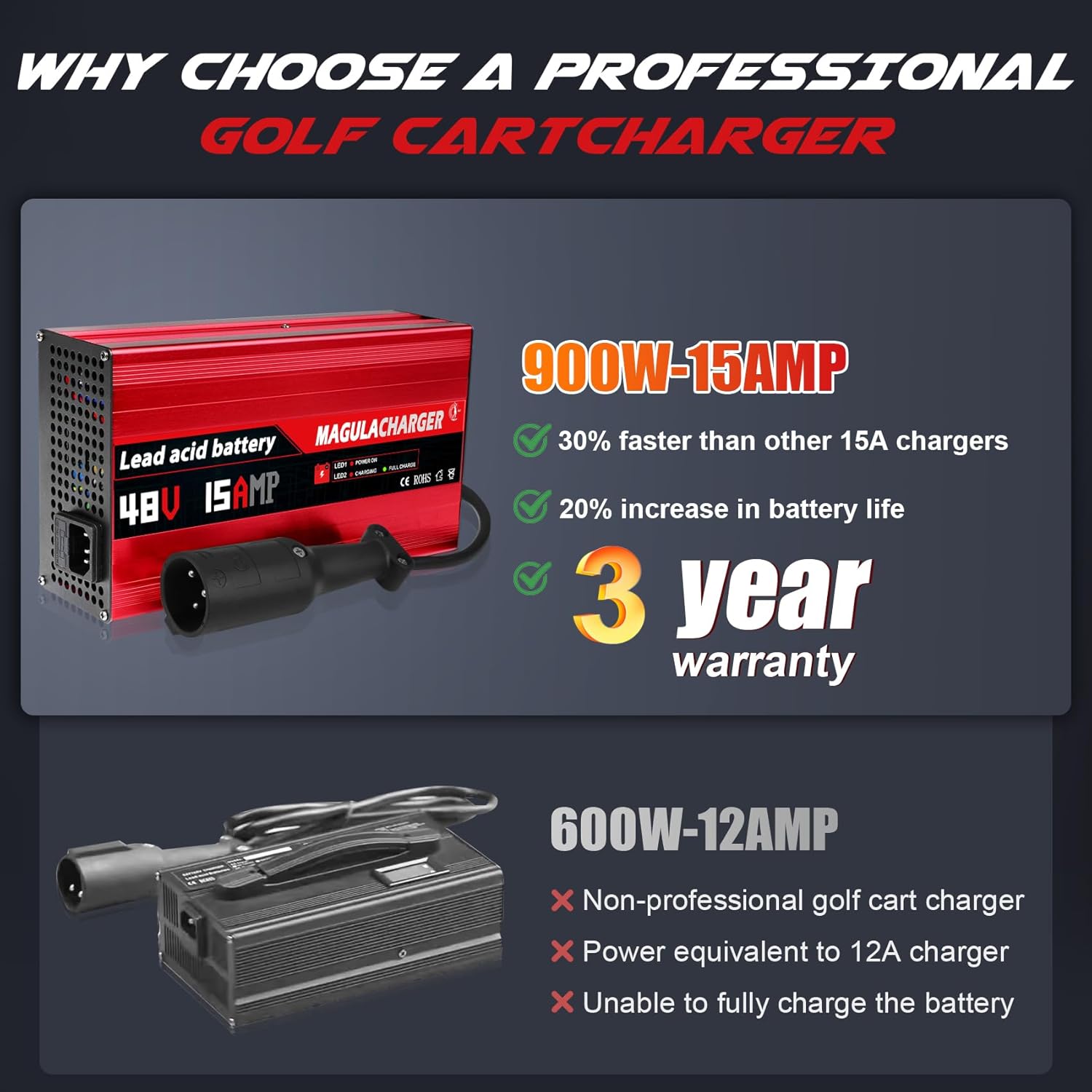 - BEST AFTER SALES SERVICE: Magula is committed to producing high-quality professional golf cart chargers. For your safe purchase, we provide you with 90-day free return and 3-year manufacturer's free warranty service for defects