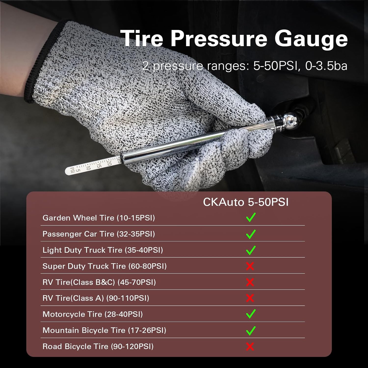 - 【Ergonomic Design】-- Package come with 2 pairs of cut-ressistant gloves, 2 sizes M and L for a perfect fit to protect you against sharp blades. Tire pressure gauge offers 2 pressure ranges: 5-50PSI, 0-3.5ba. Portable tire repair kit can be conveniently organized in a compact carry bag, which is perfect car emergency kit.