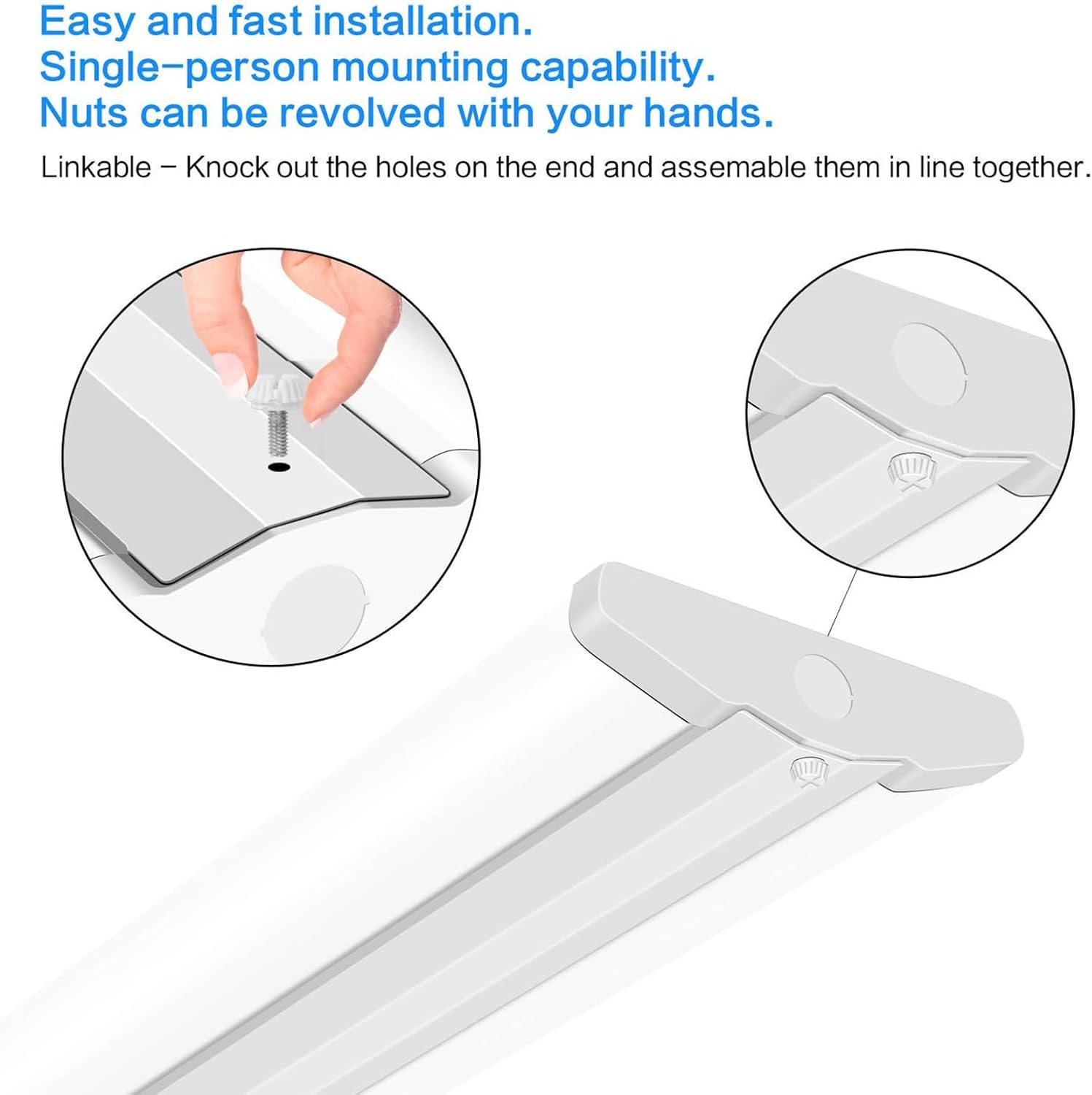 - EASY AND FAST INSTALLATION - The 8ft led garage light is very easy to wire and install. It is a light weight unit, you can help it up and wired it single handedly, besides you do not have to take any lenses off to install these fixtures. They are a snap to assemble and disassemble. Linkable design can make it easy to install individually or continuously. You can link multiple lights one by one in line together. Very easy and fast installation to save your time and money.