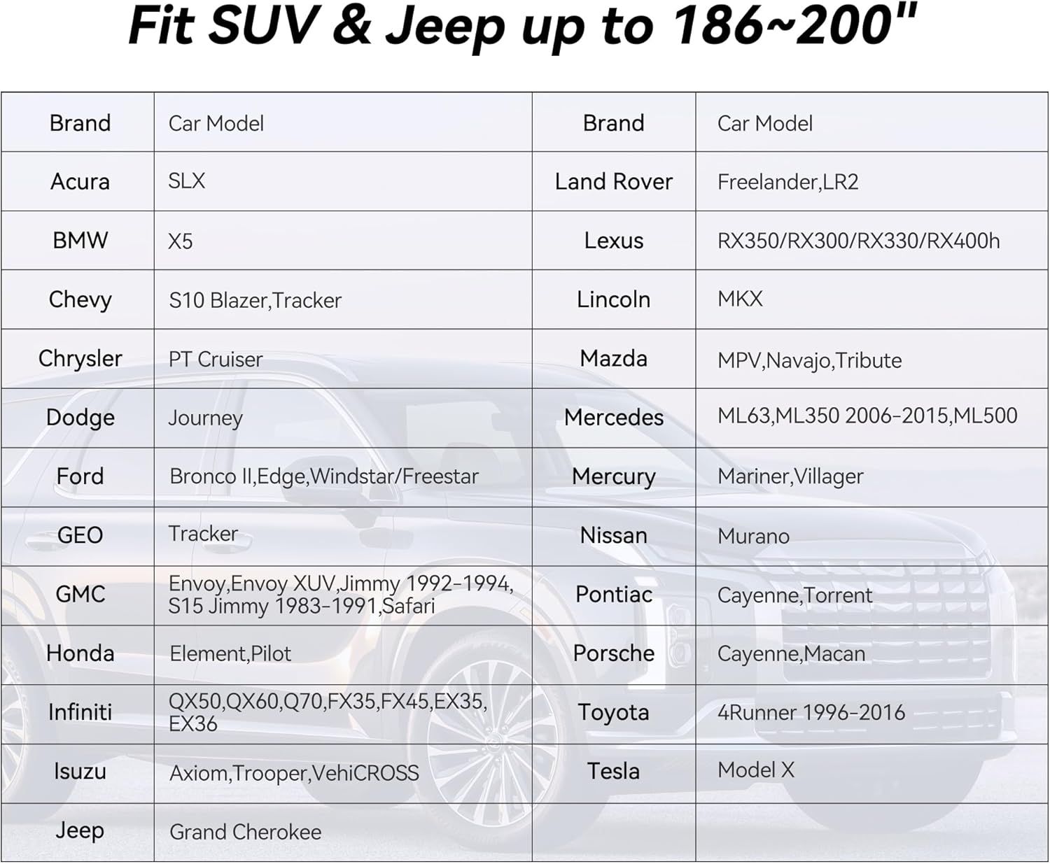- Coverage : Full exterior coverage for SUVs (Jeep Grand Cherokee, BMW X5)