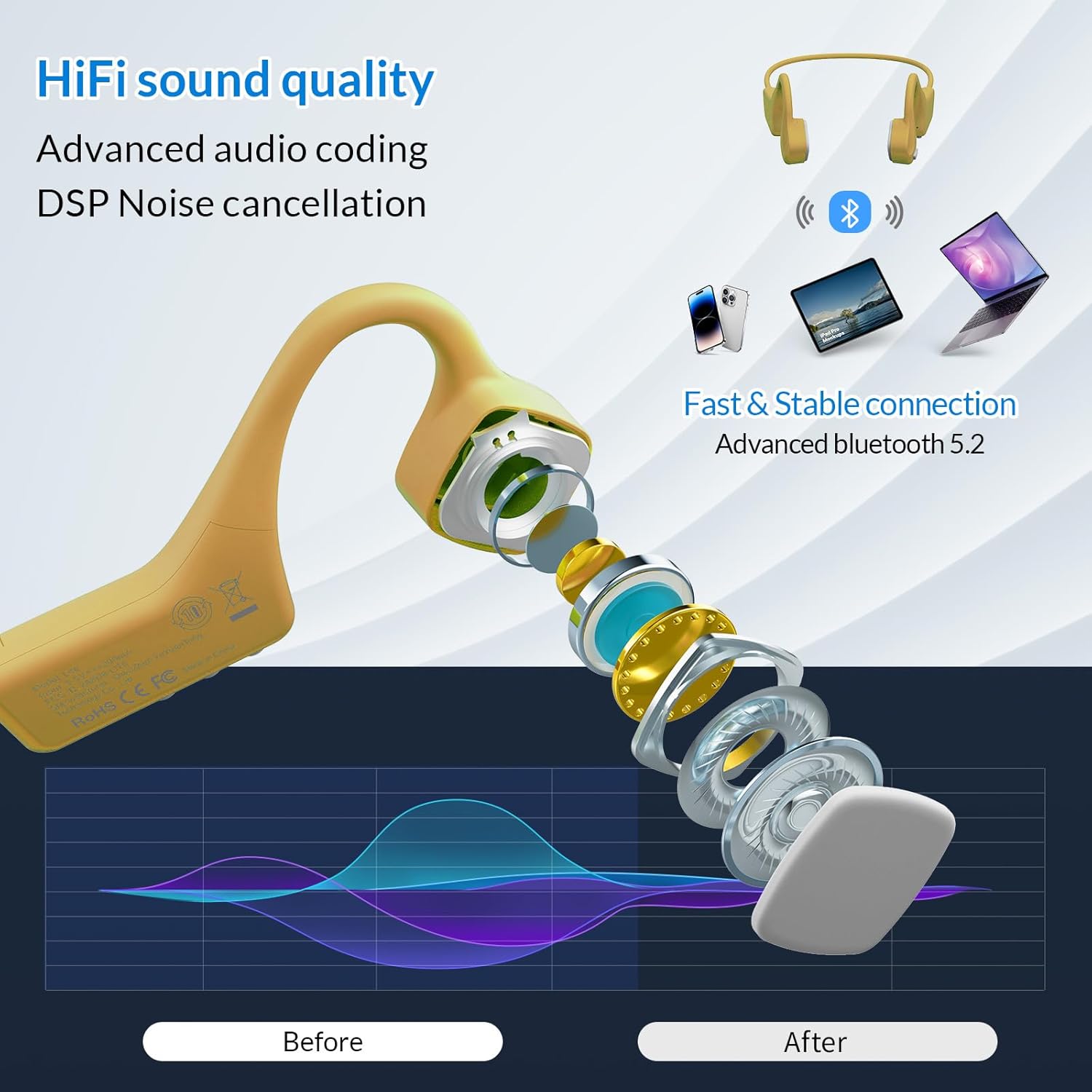 - Bone Conduction Technology: Bone conduction earphones deliver sound through your cheekbone, without passing through the external ear canal, perfect for people who like listening all day. (If listening to music in a noisy environment, please insert sponge plugs in your ears to get more loud and clear sounds)