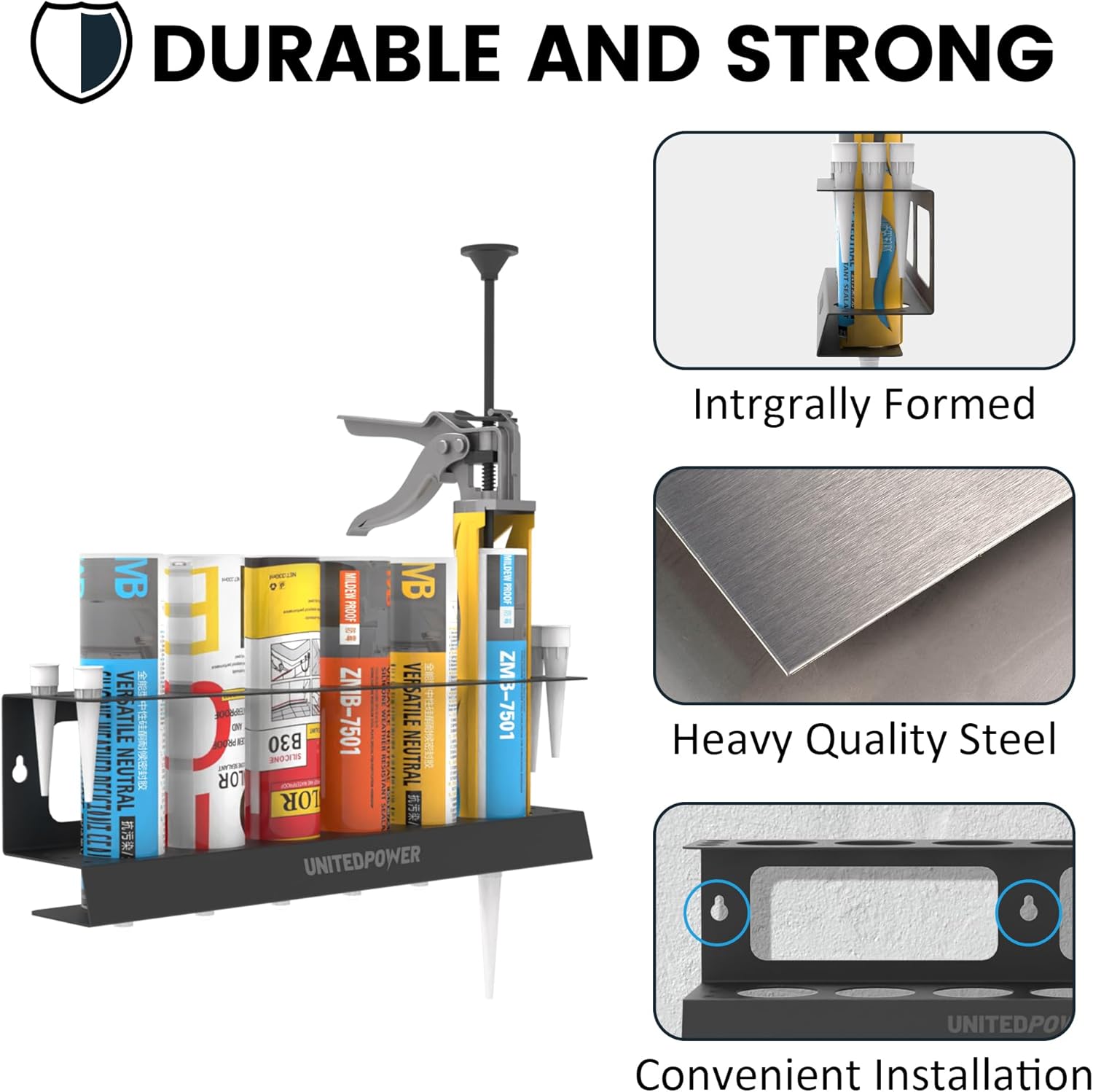 - High Quality: The storage rack made of heavy metal with powder coated finish for lasting durability, A strong base supports the caulking gun and tube well