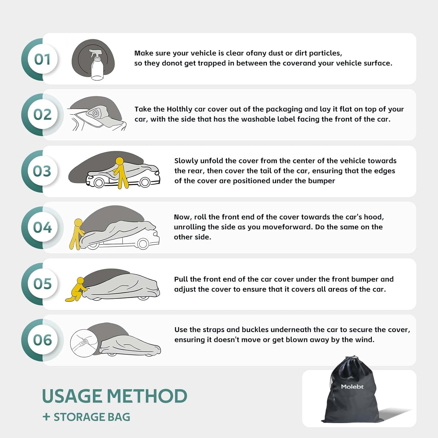 - ăHIGH-QUALITY MATERIALăïŒMolebt car cover is made of high density polyester, More wear-resistant and tear-resistant.1800mm water pressure keeps the cover 100% waterproof. Light weight is easy to put on and take off.