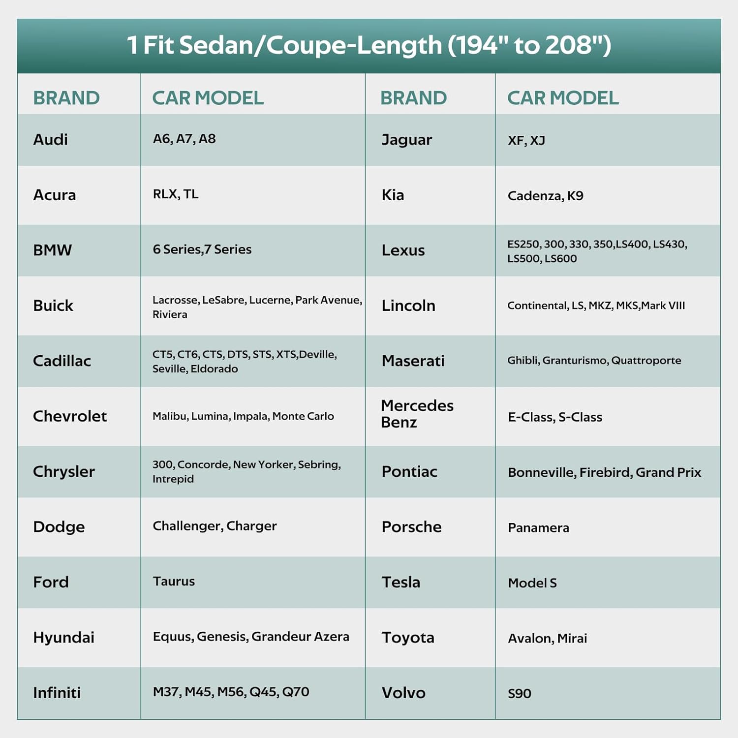 - ăCHOOSE THE RIGHT MODELă: Molebt car cover fits Sedan & coupe 194 to 208 inch. For example Dodge Charger/Challenger, BMW 7 Series, BMW 5 Series, Jaguar XJ, Lincoln MKZ, Ford Taurus, Toyota Avalon, Chrysler 300, Audi A8, Buick Lacrosse, Tesla Model S, etc.