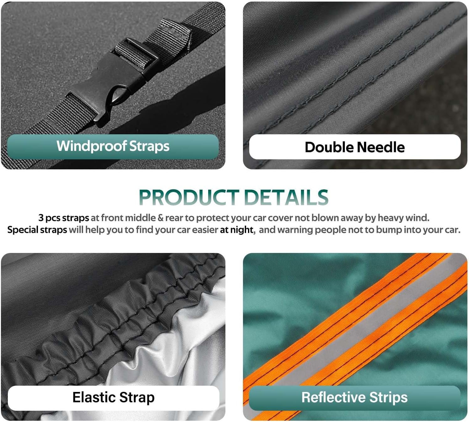 - ăPRODUCT DETAILS:ă: 1. The car cover has three pairs of windproof straps, each pair of windproof straps is reinforced, even in windy weather will not be blown away. 2. With fluorescent orange designs, it can glow at night to avoid accidental impact.