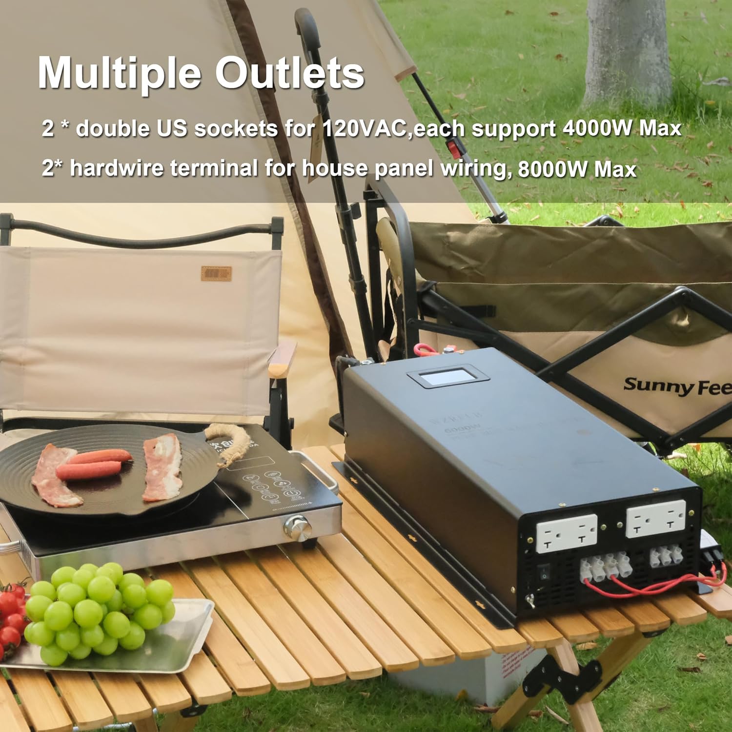 - FEATURES: 2pcs dual 120V outlets with max 4000W each, 1*240VAC hardwire terminal(3-wire) with 8000W max (L+N=240V) and a hardwire terminal(4-wire) with Multi-mode (L1+L2=240V, L1+N=120V, L2+N=120V ),support 120VAC and 240VAC output at the same time,up to 91.6% efficiency