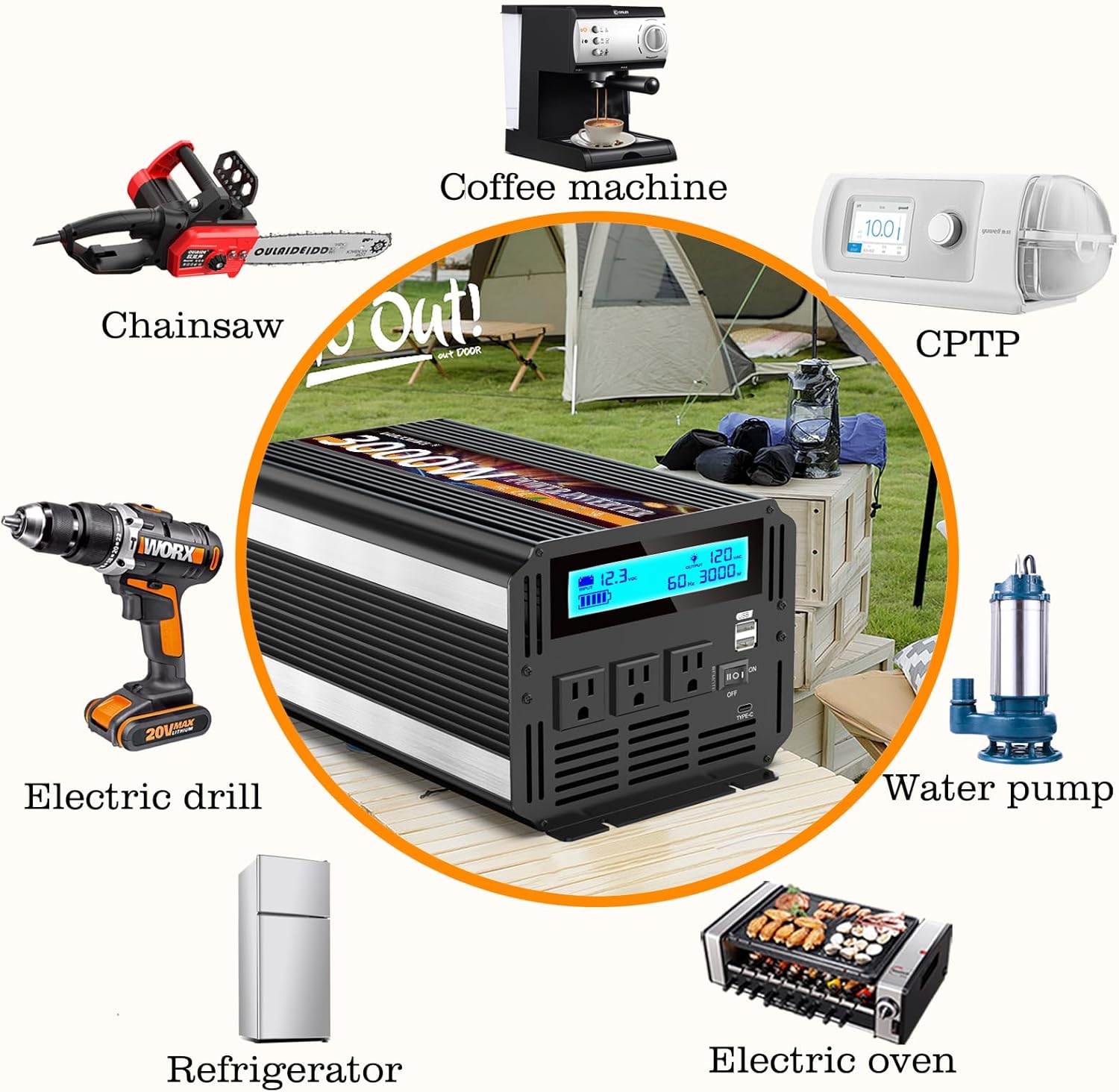 3000W Power Inverter 12V DC to AC 110V/120V (Peak) 6000W Converter 3 sockets car Inverter with Remote Control and LED Display 3.4A USB Port
