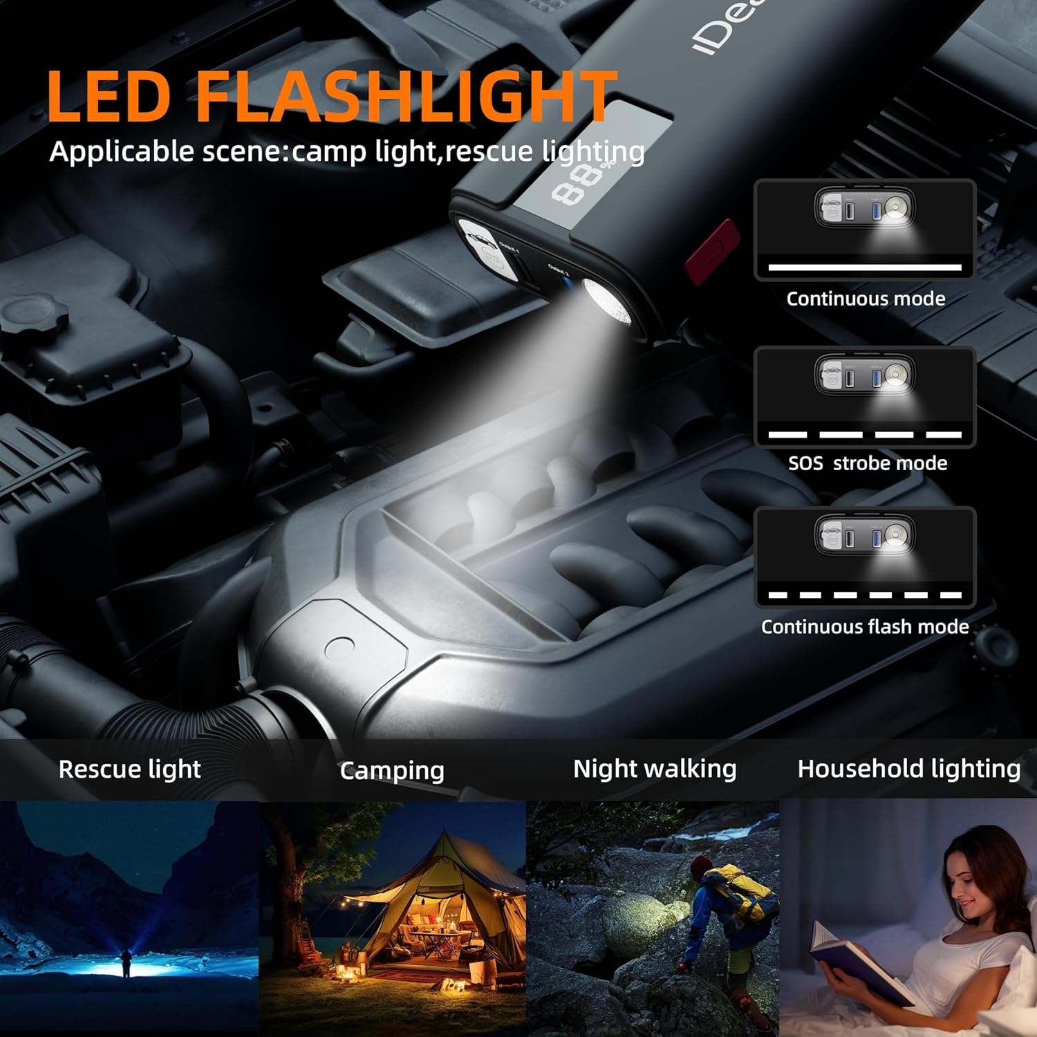 - ULTRA-BRIGHTNESS LED FLASHLIGHT - IDEAPLAY Car jump starter has a built-in super bright LED flashlight with 3 modes: Flashlight, SOS, and Strobe. It is a great help while you are going to start your car under darkness. Also, it can act as a camp light or a life saver when you run into emergency situation.