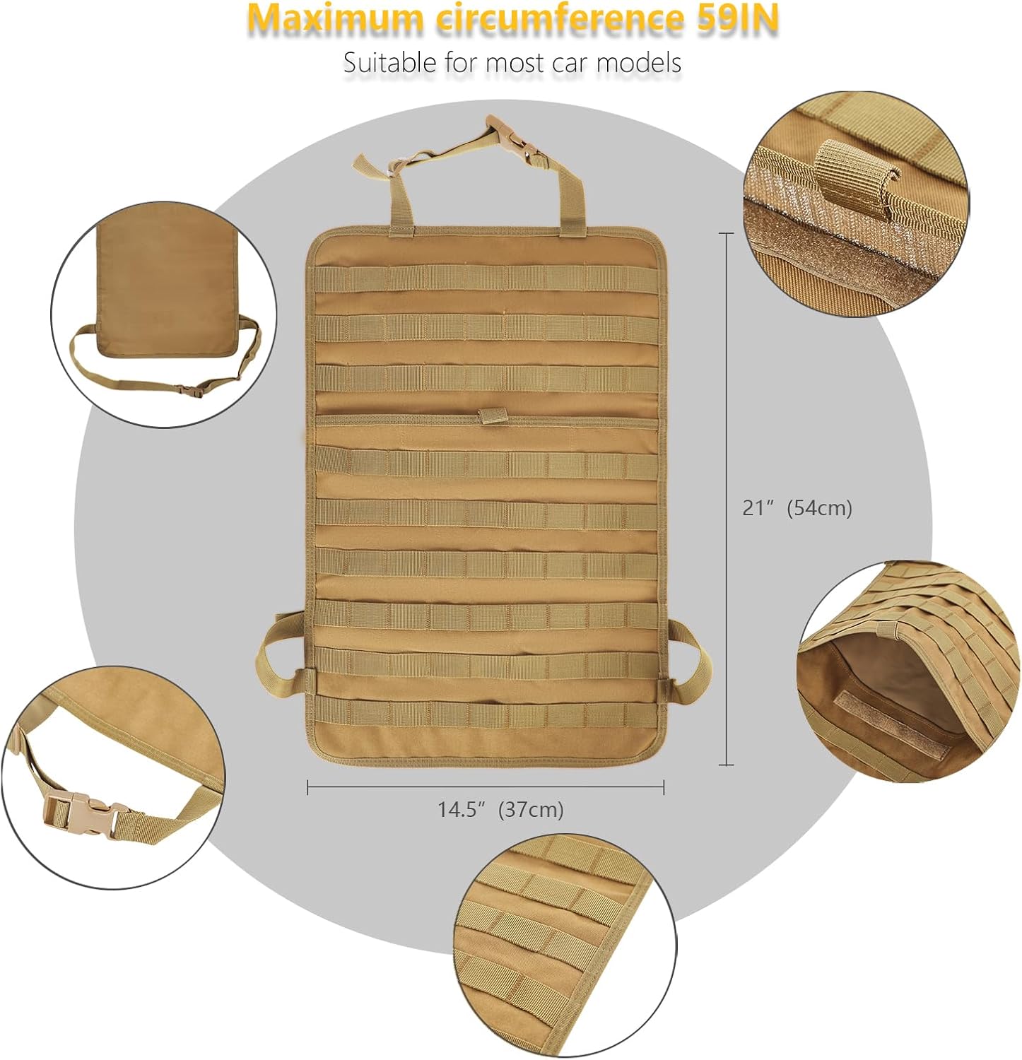 - π Multifunctional Storage - Design with 5 Molle bags on the back to help you store tactical gear & personal items and save space. Difference sizes of Molle bags help you classify your items so easily.you can set the Tactical Seat βBack Organizer according to your own habits and need.