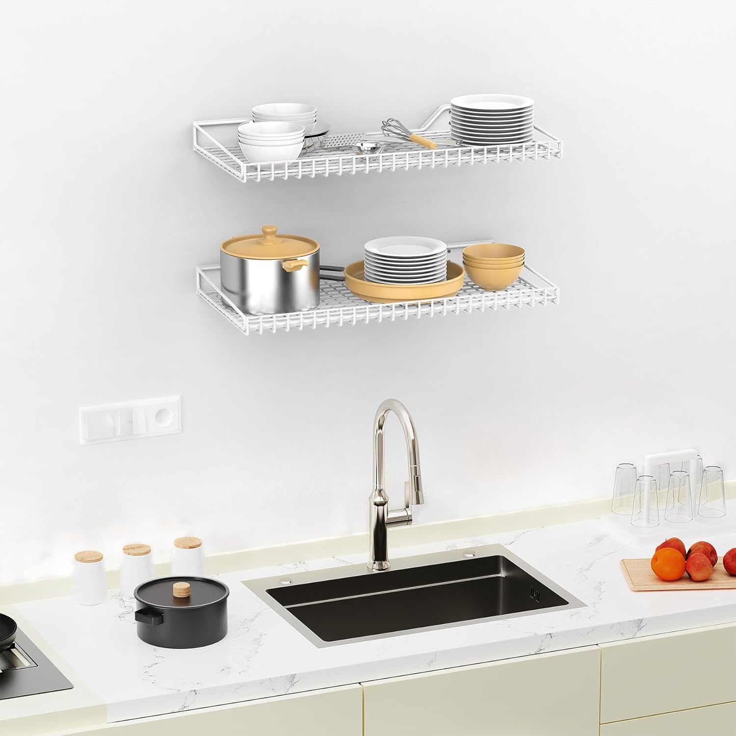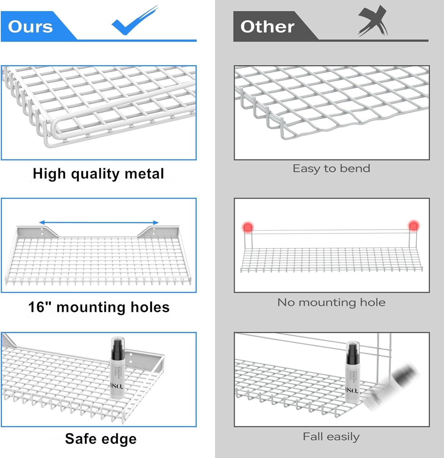 - Secure Storage: Wall mounted shelves feature folded edges to securely hold items in place. The folded edge design prevents stored objects from sliding off.