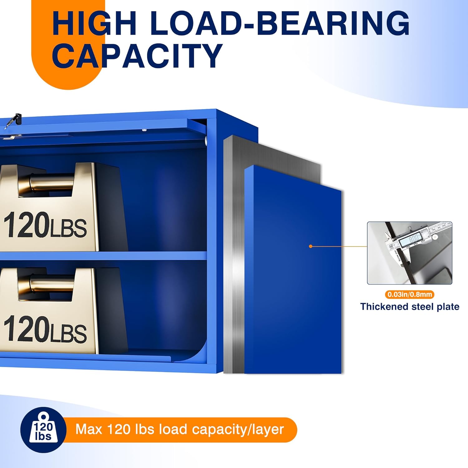 - 『PREMIUM QUALITY MATERIAL』 Heavy Duty Garage Storage Cabinets are made from 0.8mm high pressure steel plate that can withstand loads of up to 120lbs; the powder coating gives the cabinets a textured look and is rust and scratch resistant to complement a variety of decor styles.