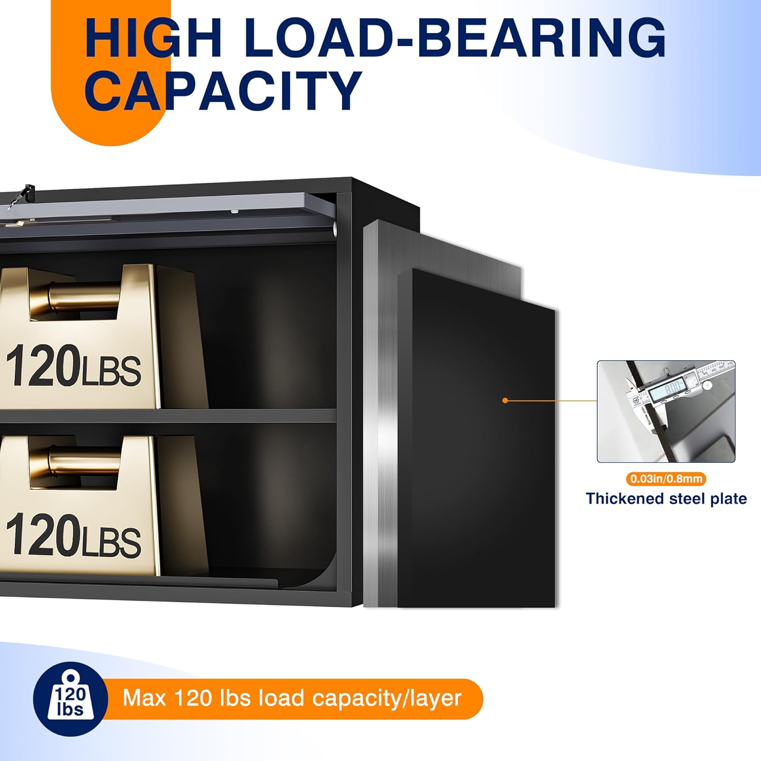 - ăPREMIUM QUALITY MATERIALă Heavy Duty Garage Storage Cabinets are made from 0.8mm high pressure steel plate that can withstand loads of up to 120lbs; the powder coating gives the cabinets a textured look and is rust and scratch resistant to complement a variety of decor styles.