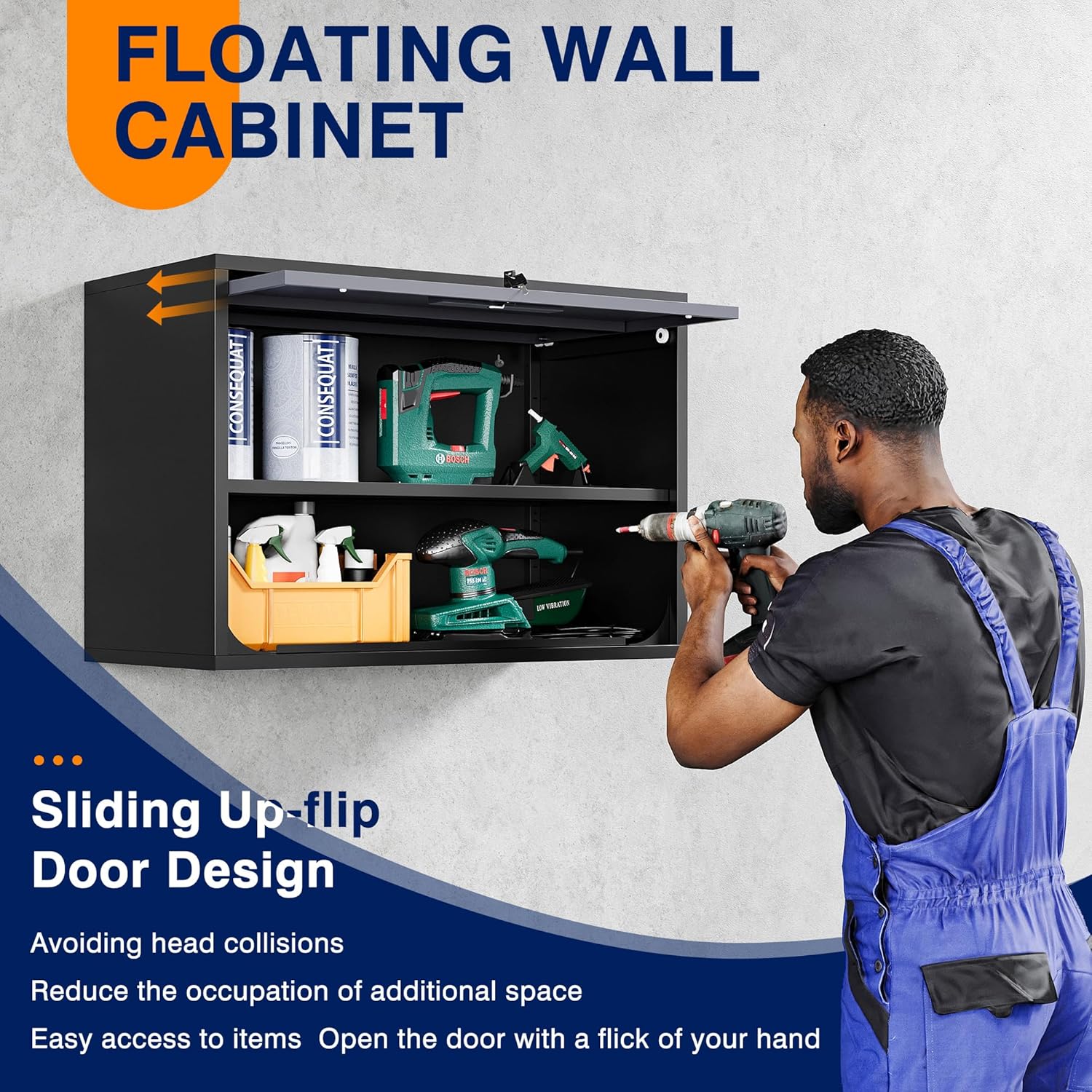 - ăUTILIZE UPPER SPACE RATIONALLYă 31.5"W x 15.7"D x21.6"H-floating cabinet can effectively utilize the upper wall space, providing you with more storage space. Safety locked cupboards allow you to store hazardous paints to keep children and pets from touching them