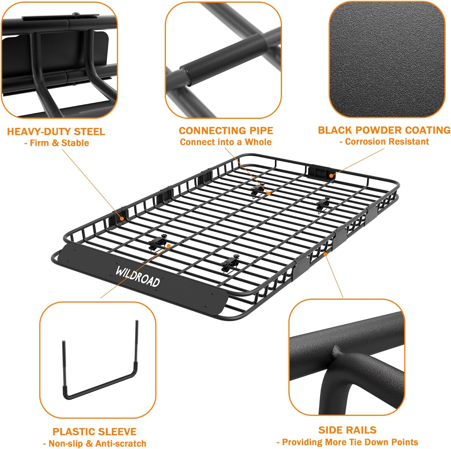 - [HEAVY DUTY]: Wildroad roof basket made of solid and premium steel pipe can hold up to 150 lbs cargo. Durable black powder coating prevent it from all weather conditions. Highest standard craftsmanship in the industry ensure its quality, each screw matches welding frame accurately.
