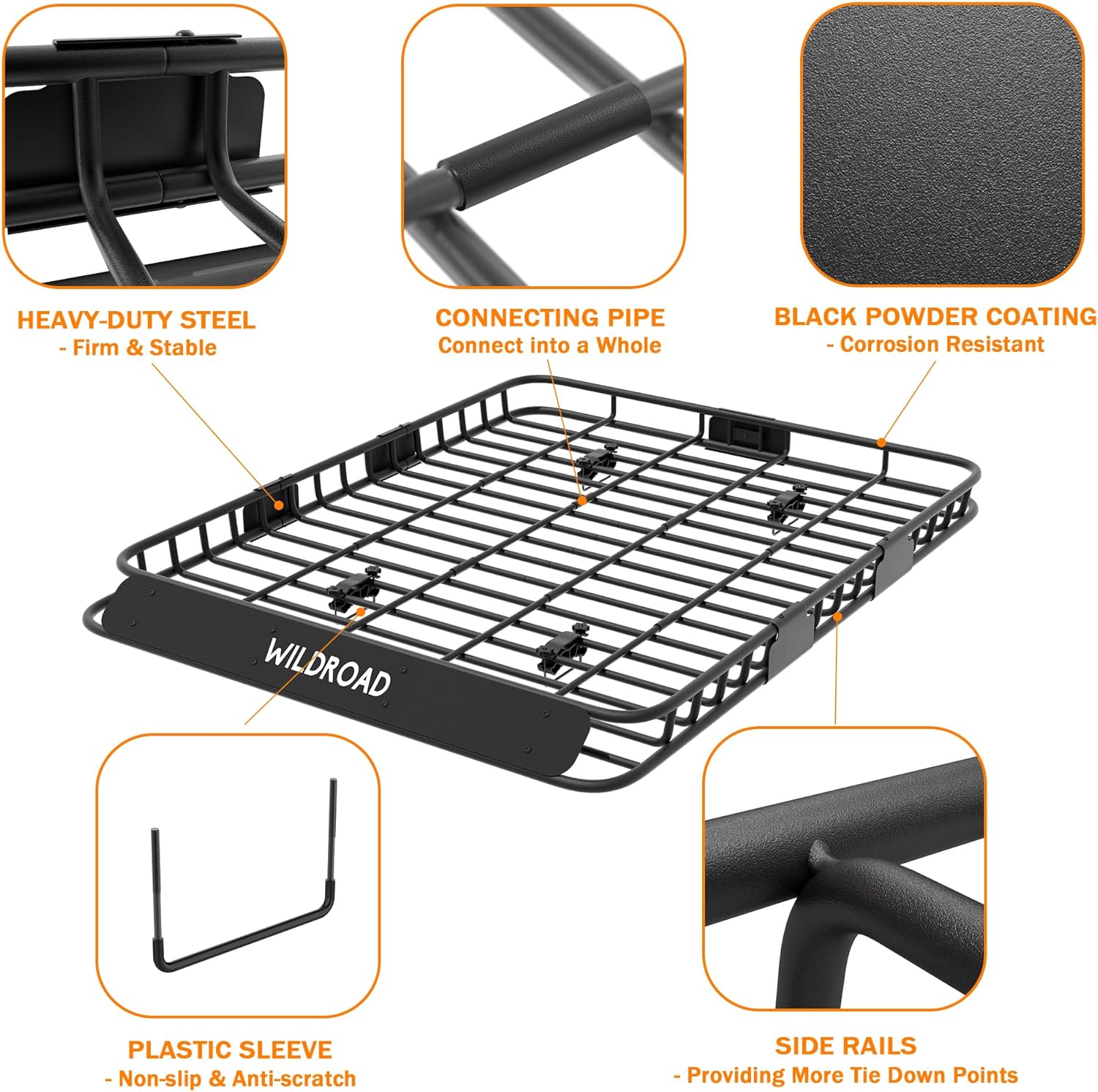 - [HEAVY DUTY]: Wildroad roof basket made of solid and premium steel pipe can hold up to 150 lbs cargo. Durable black powder coating prevent it from all weather conditions. Highest standard craftsmanship in the industry ensure its quality, each screw matches welding frame accurately.
