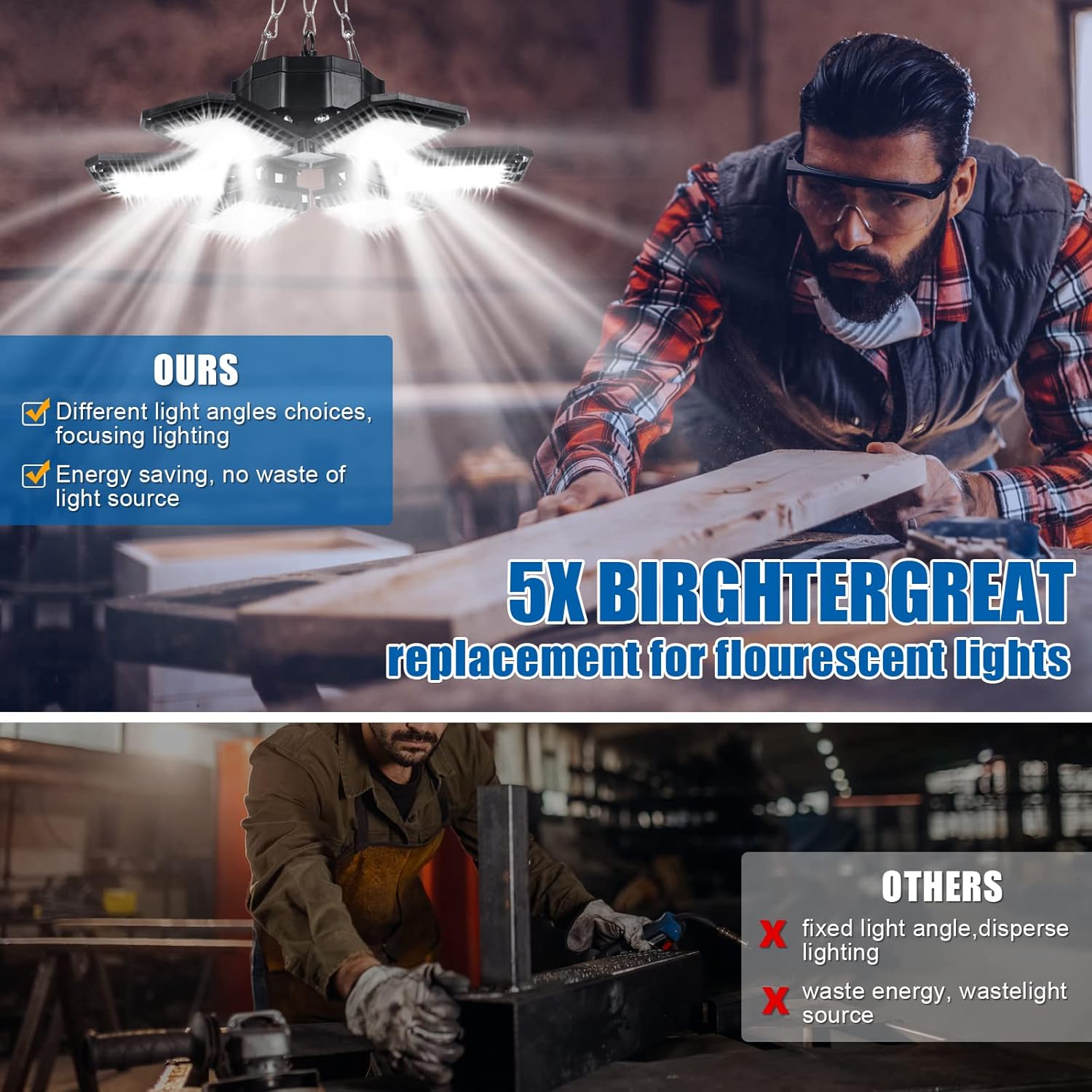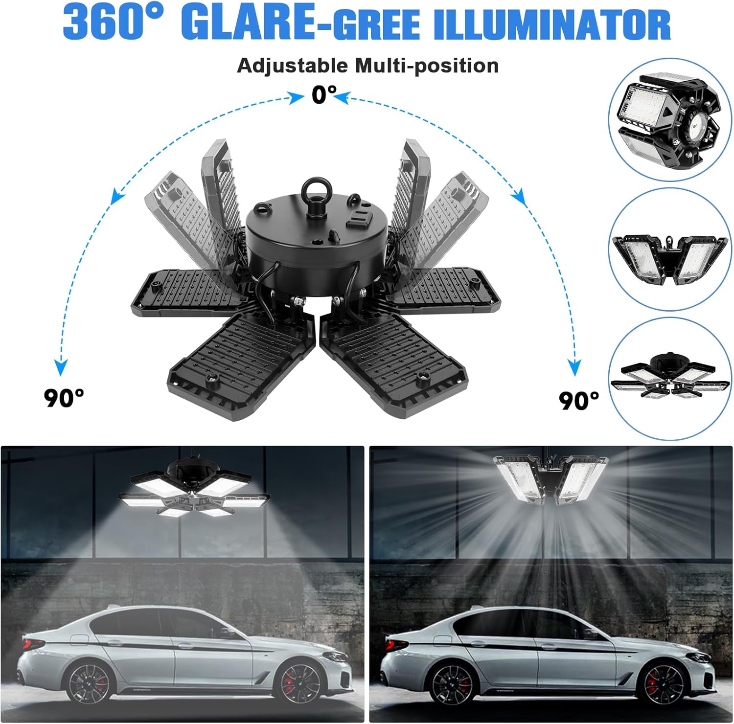 - 【6+1 Newest Garage Lights】With 6+1 deformable panels, the best led garage ceiling lights can be adjustable from 0 to 90 degree, which illuminate each corner of your garage in 360 full coverage without visual blind spots and dizziness. The workshop lights will provide better light than 3, 4 and 5 panel garage lights on the market.