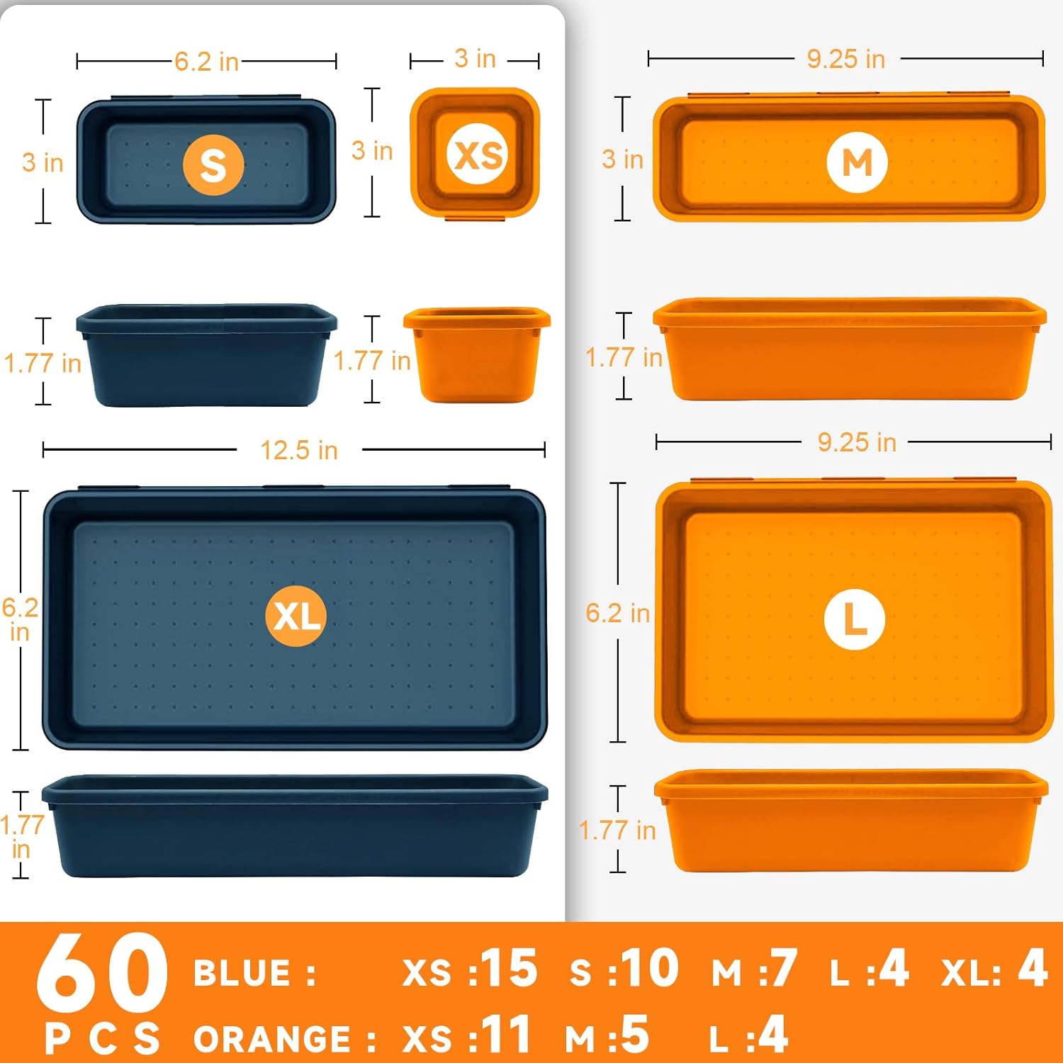 - [60 Pack & 5 Sizes] - Our tool box organizer bins include 60 trays:4 x XL size (12.5x6.2x1.77in), 8 x L size (9.25x6.2x1.77in), 12 x M size(9.25x3x1.77in), 10 x S size(6.2x3x1.77in), 26 x XS size(3x3x1.77in). PS: 40pcs in Blue, 20pcs in Orange.
