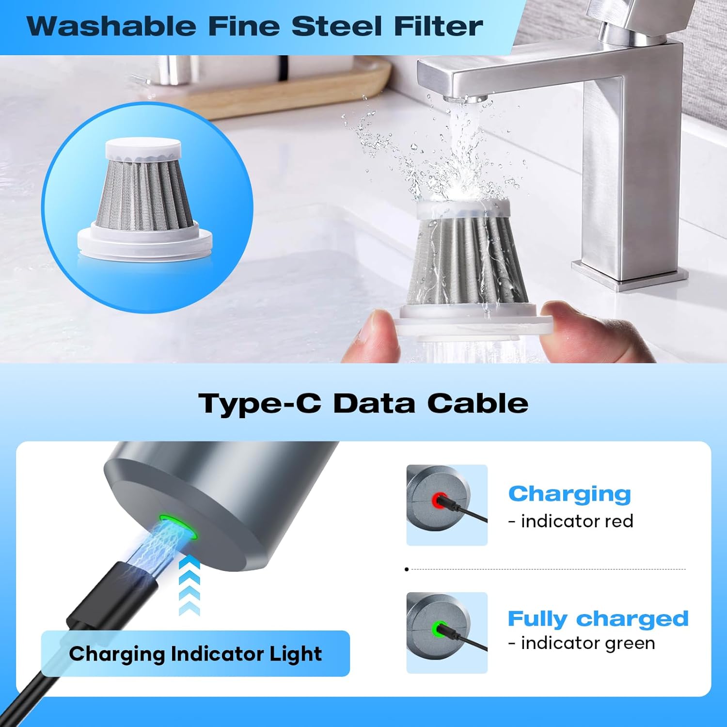 - ăHEPA FilterăThe handheld vacuum cleaner is equipped with two different filters. The HEPA filter can be washed and can be used for 2-3 months. The upgraded fine steel filter can be used again with a simple wash, and the service life can be more than 1 year.