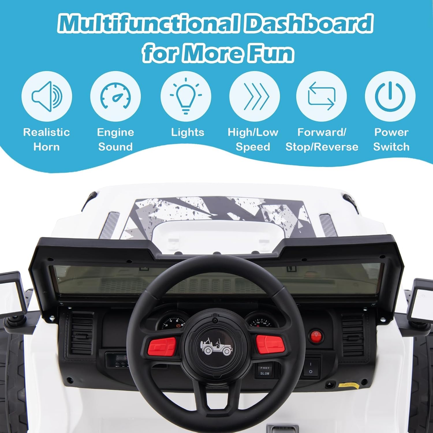 - REALISTIC DRIVING EXPERIENCE: Your kids can simply accelerate, decelerate or brake by operating the realistic non-slip foot pedal. Designed for small hands, the steering wheel has rounded edges and a comfortable grip, complete with horn and engine sound buttons. And the windshield and rearview mirror also greatly increase the sense of reality. The stylish body of the ride on jeep car is made of safe and high quality material, which is firm and durable. No child will refuse this perfect gift.