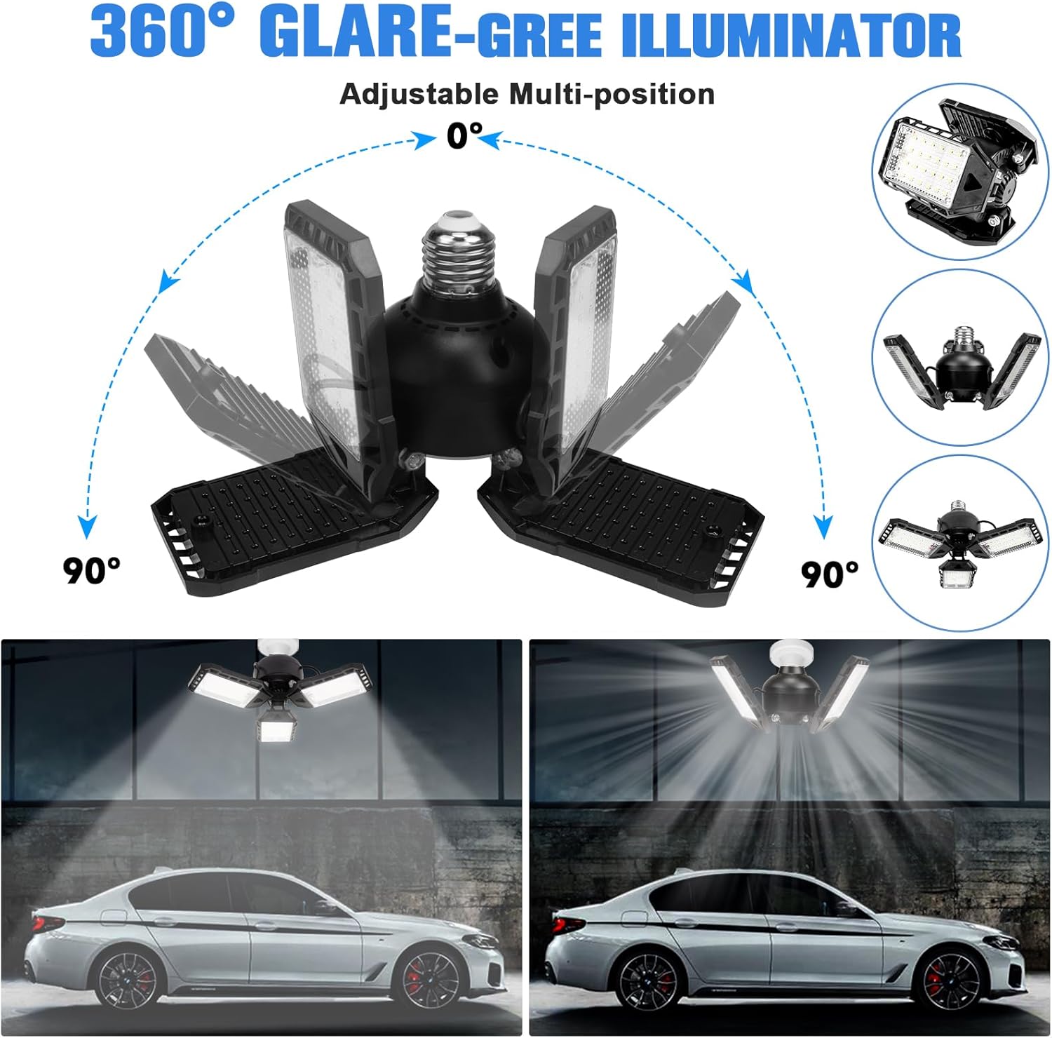 - 【3 Panels Garage Lights】With 3 deformable panels, the best led garage ceiling lights can be adjustable from 0 to 90 degree, which illuminate each corner of your garage in 360 full coverage without visual blind spots and dizziness. The led garage lights 2 pack will provide better light than traditional light bulb