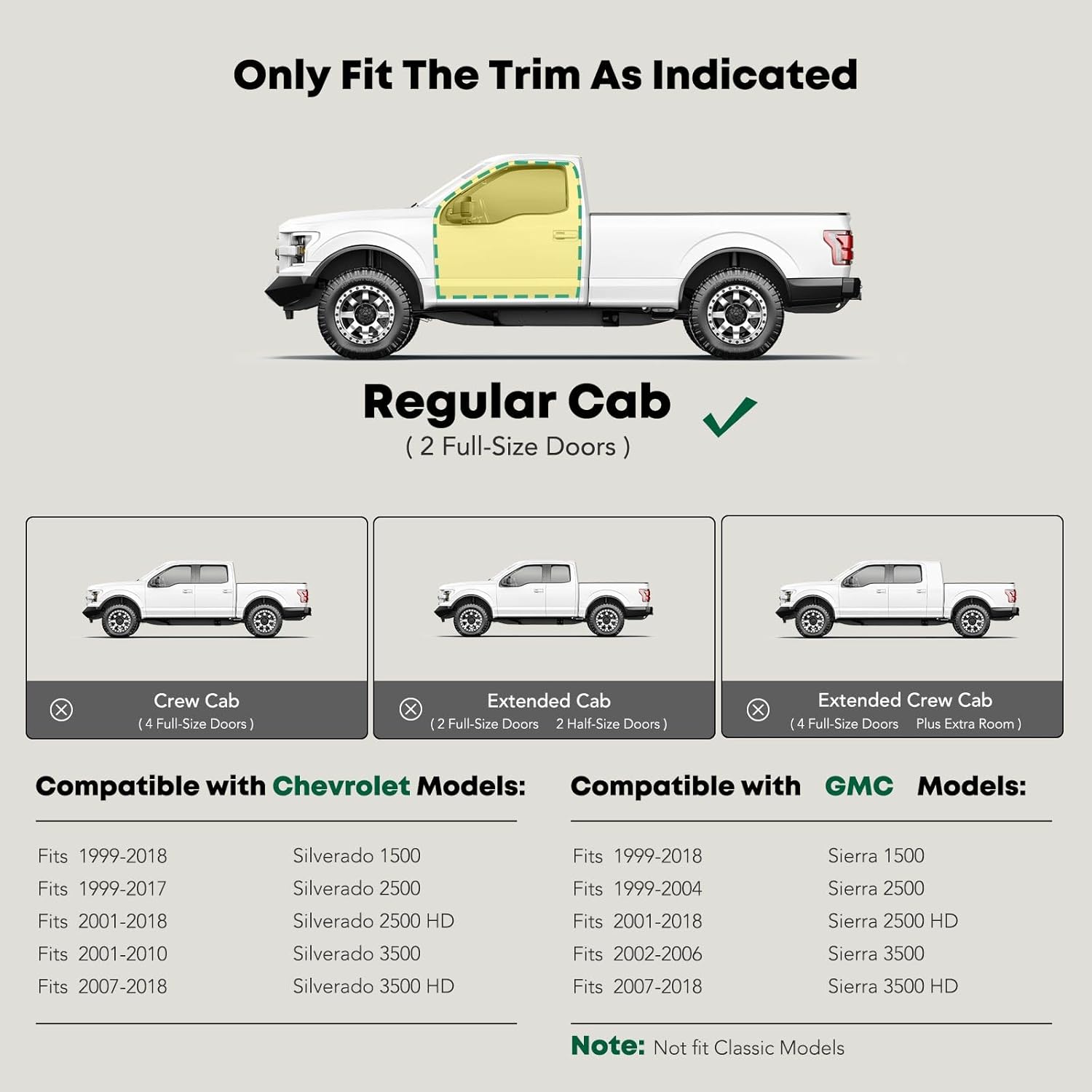 - Confident Fitment: Our side steps are compatible with Chevrolet and GMC Models: Silverado/Sierra 1500 1999-2018, Silverado 2500 1999-2017, Sierra 2500 1999-2004, Silverado/Sierra 2500 HD 2001-2018, Silverado 3500 2001-2010, Sierra 3500 2002-2006, Silverado/Sierra 3500 HD 2007-2018---Standard Cab/Regular Cab (2 Front Doors); Excluding C/K Classic. Our excellent sidebars are long-lasting and will enhance the appearance of your vehicle.