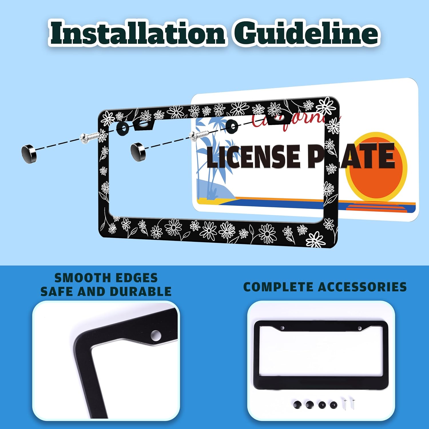 Black and White Daisies License Plate Frame Flower Art License Plate Holder for Front or Rear Car Tags Stainless Steel Funny Car Decoration with Screws 6.3 X 12.2 in