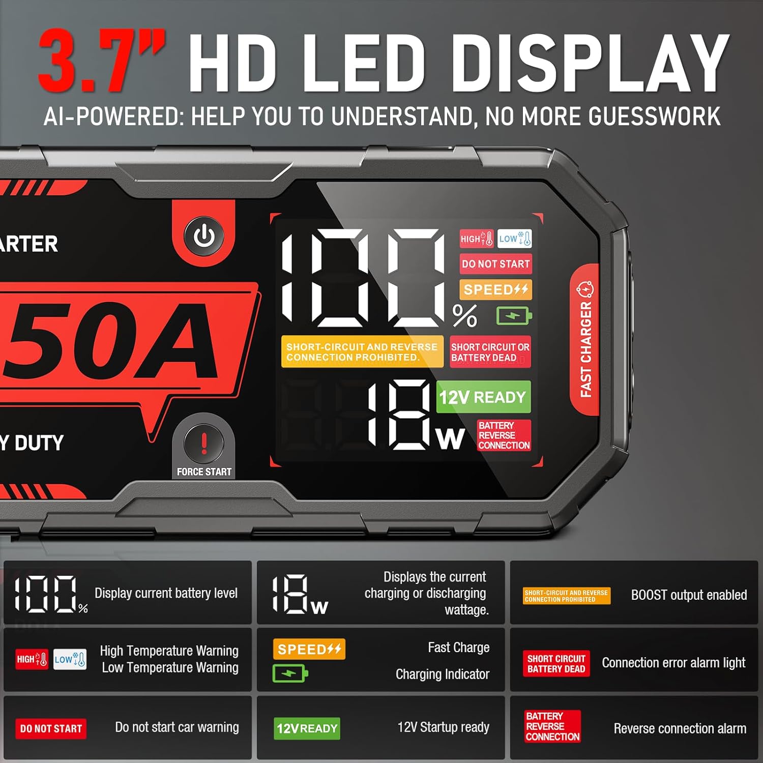 - ă3.7" HD LED DisplayăThis battery jumper starter portable has a 3.7" smart colorful screen provides you with all the intuitive information about operational status, battery level and possible errors at a glance! so you can know when to start the car intuitively.