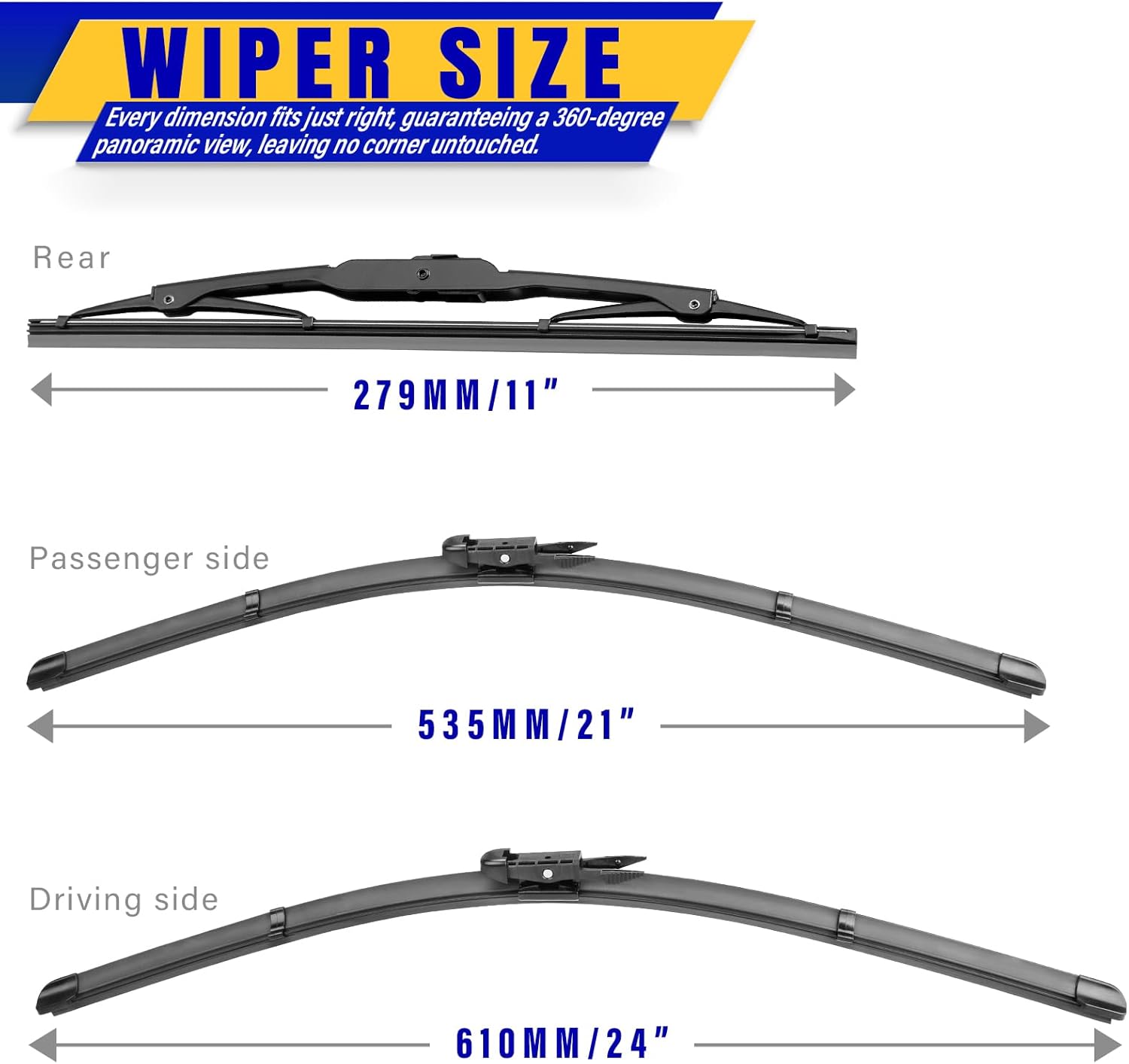 - ăWORRY-FREE SHOPPINGă 3Pcs wiper blades 24"+21"+11" and Instruction Manual. One Year warranty! Refund or return anytime in one year, Long life, smooth engagement.