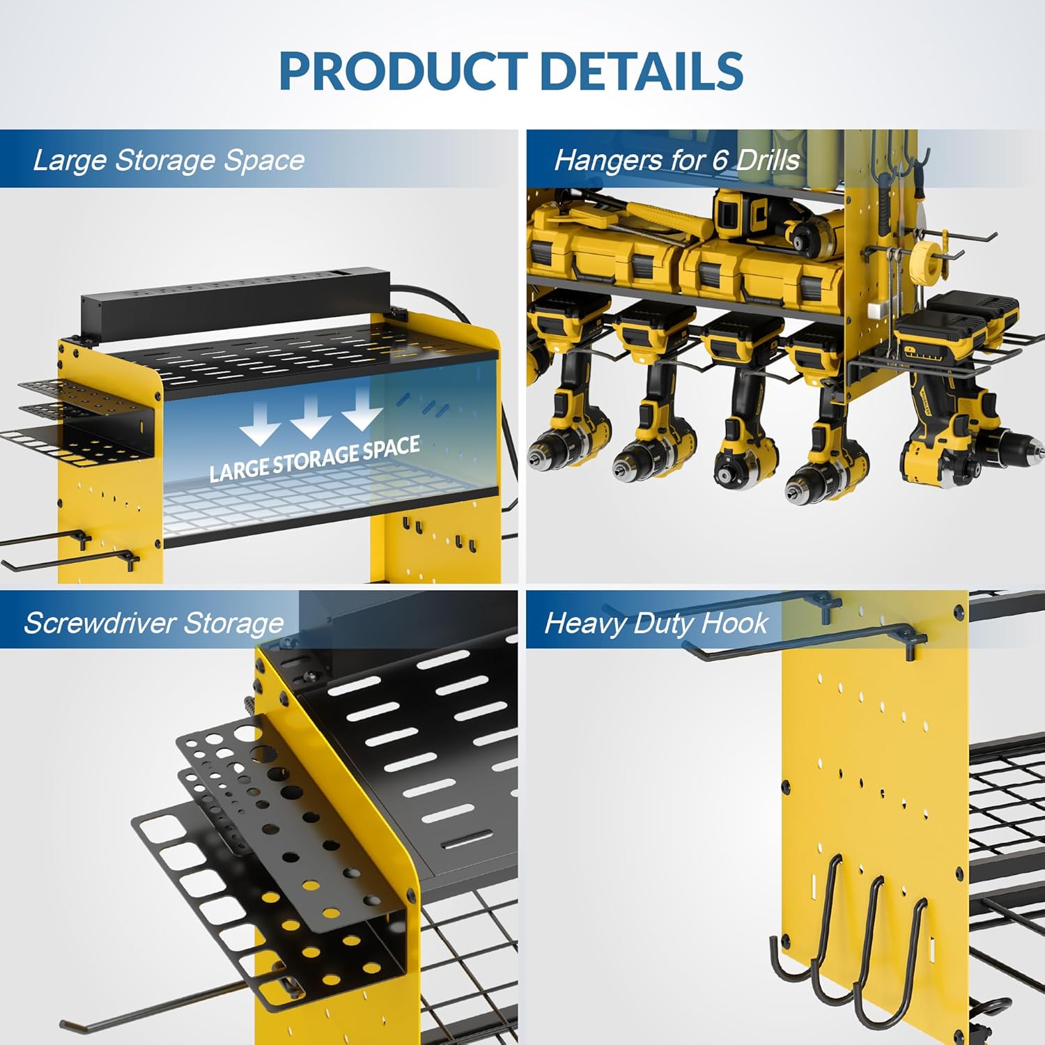 Power Tool Organizer with Charging Station, 4 Layers Garage Storage Rack with 6 Drill Holders, Father's Days Gift For Dad, Wall Mount Garage Organizer Built in 8 Outlets Power Strip, Yellow