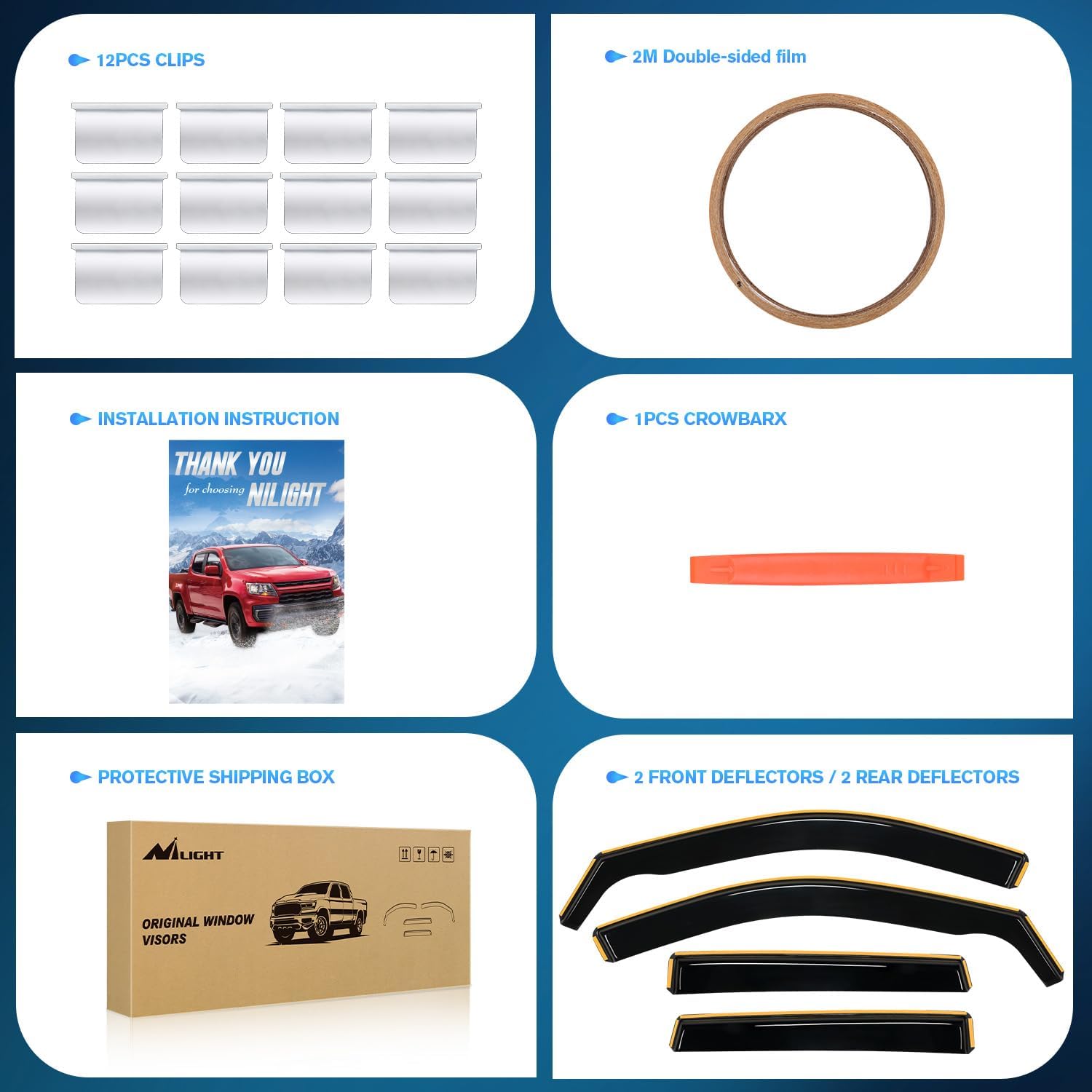 - QUICK AND EASY INSTALL: Nilight Wind Deflectors provides perfect fit for your Car. Just slip it onto your carโs window and your job is done within minutes. There is no drilling or no tools required.