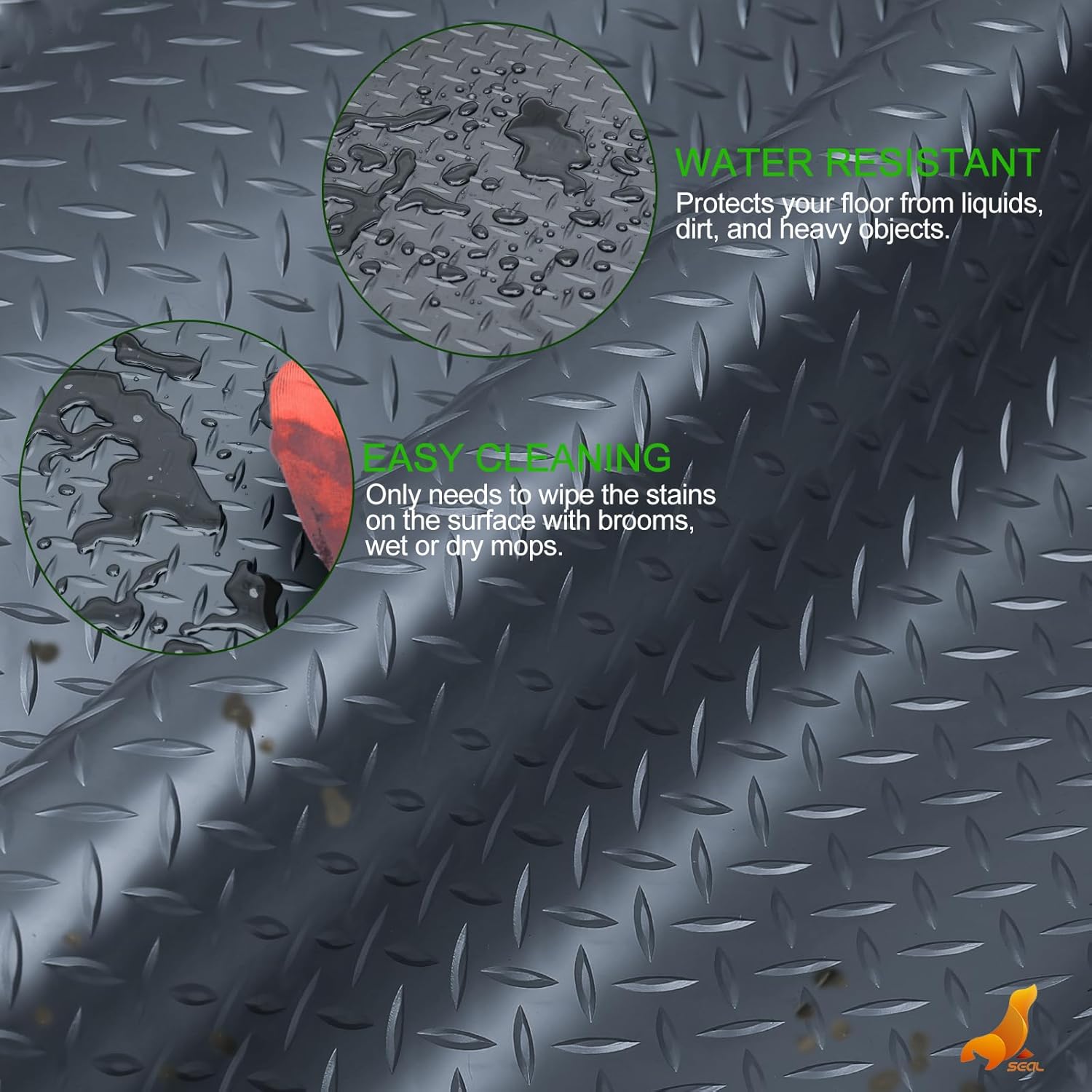 - [Protect Your Floors Like Never Before] - Keep your garage floor looking new with SEALâs mats. Their special diamond plate design makes sure you wonât slip, giving you a safe way to walk in and out. These mats stop all kinds of damage like scratches and spills from ruining your floors, offering full coverage.