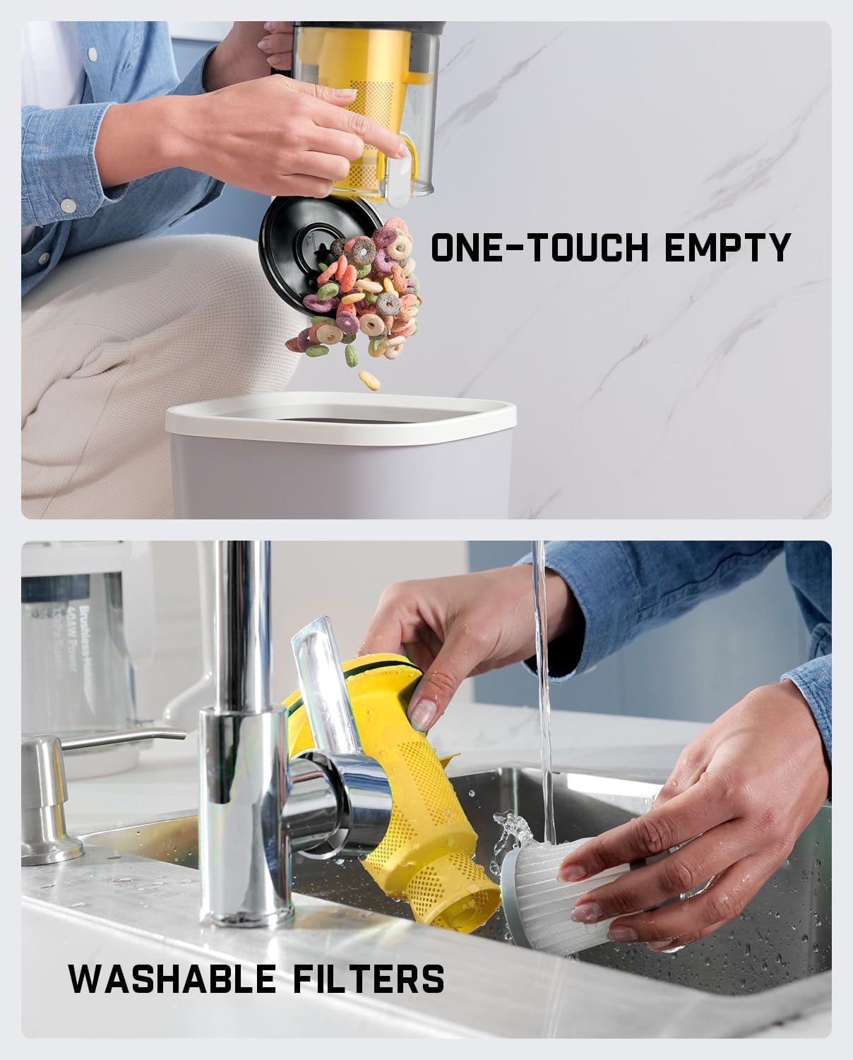 - XL Dust Cup & One-Touch Empty: 600 mL high capacity dustbin means more cleaning and less emptying. For more convenience, you can eject dirt and debris with one touch-not getting your hands dirty