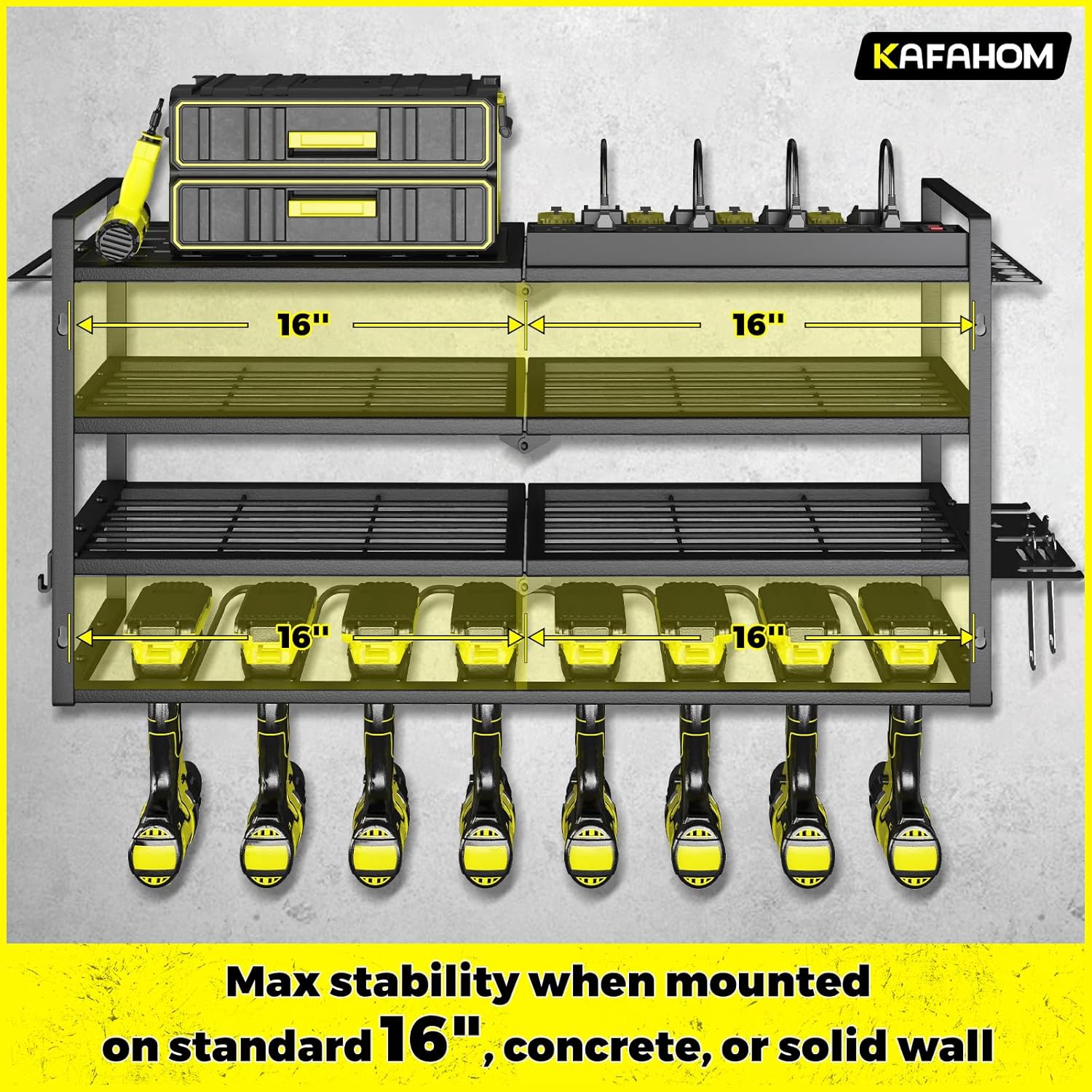 - Ample Capacity: Increase your workspace efficiency with our KAFAHOM power tool organizer wall mount with charging station, boasting four tiers of spacious storage. From power tool accessories to workshop essentials, there's room for everything you need to stay organized and productive.