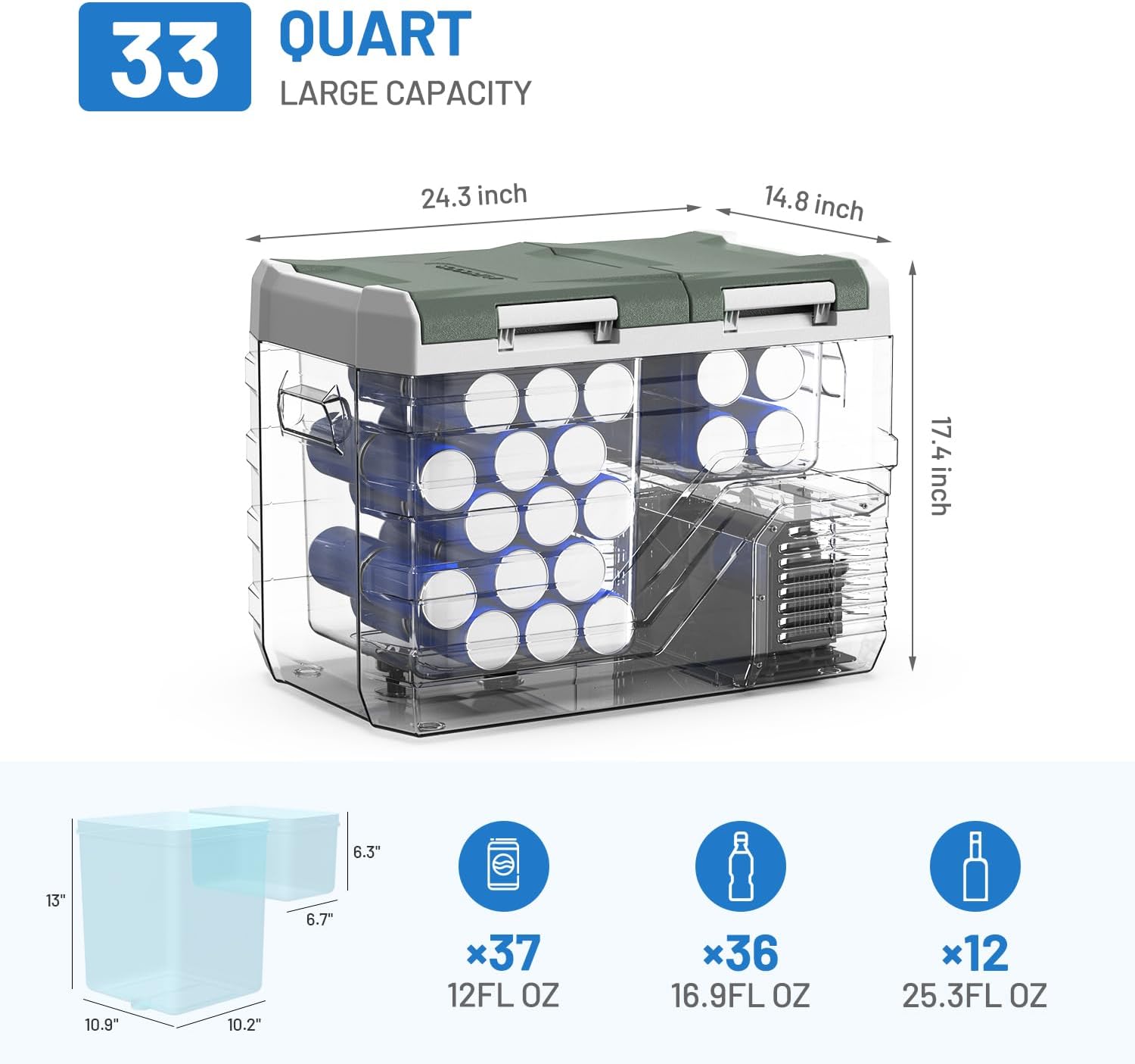 - LARGE CAPACITY & 2-WAY DOOR: Our car refrigerator is equipped with an expansive 25 quart capacity, which can hold up to 36 cans of cola (12fl oz) or 37 bottles of water (16.9fl oz) or 12 bottles of wine (25fl oz), allowing you to enjoy chilled beverages and fresh food during the trip. This 12 volt car fridge is designed with two doors with different opening direction, which make it convenient for you to access from any angle.