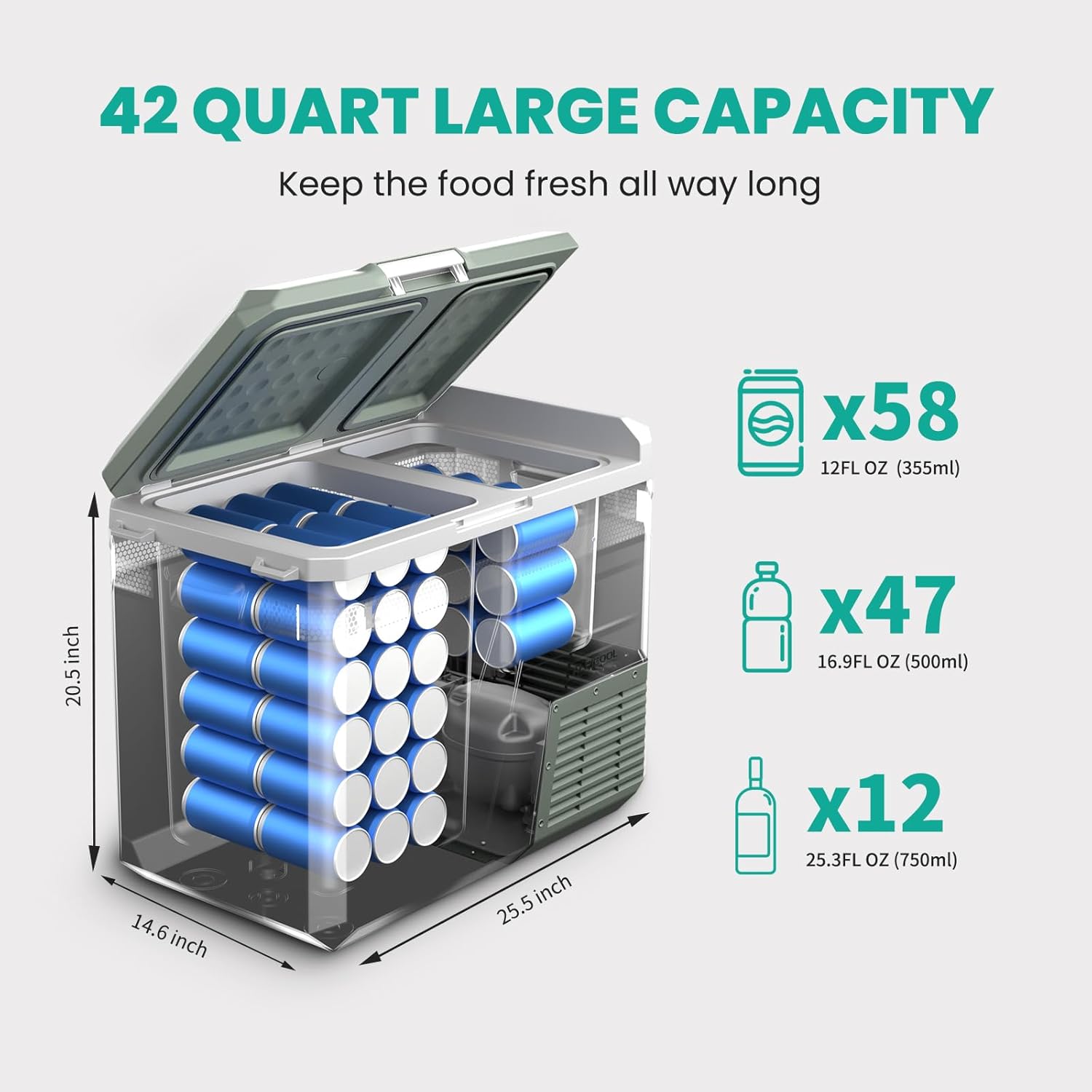 - LARGE CAPACITY: Equipped with 42 quarts of large storage space, this car refrigerator can hold up 58 cans of cola (12fl oz) or 47 bottles of water (16.9fl oz), or 12 bottles of wine (25fl oz), which meets all your daily needs like short trip, camping, weekend gatherings. With the temperature range from 68℉ to -4℉, it can be used as a fridge or a freezer, which allows you to store a variety of foods while keeping fresh, and no ice needed!