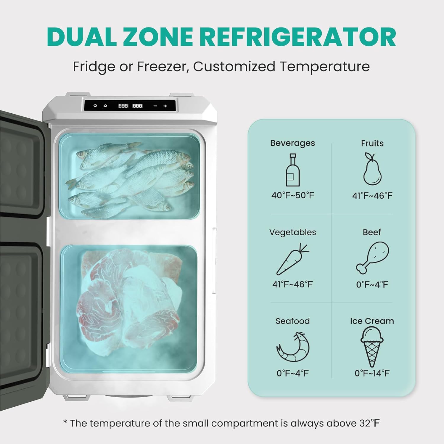 - POWERFUL COMPRESSOR: Adopts a powerful compressor, with advanced refrigeration technology, this portable car refrigerator can rapidly cool down from 77℉ to 32℉ in just 15 minutes and reach as low as -4℉ within an hour, which allows you to store a variety of foods while keeping fresh. Equipped with two modes, ECO mode (45W) for energy saving and MAX mode (60W) for fast cooling.