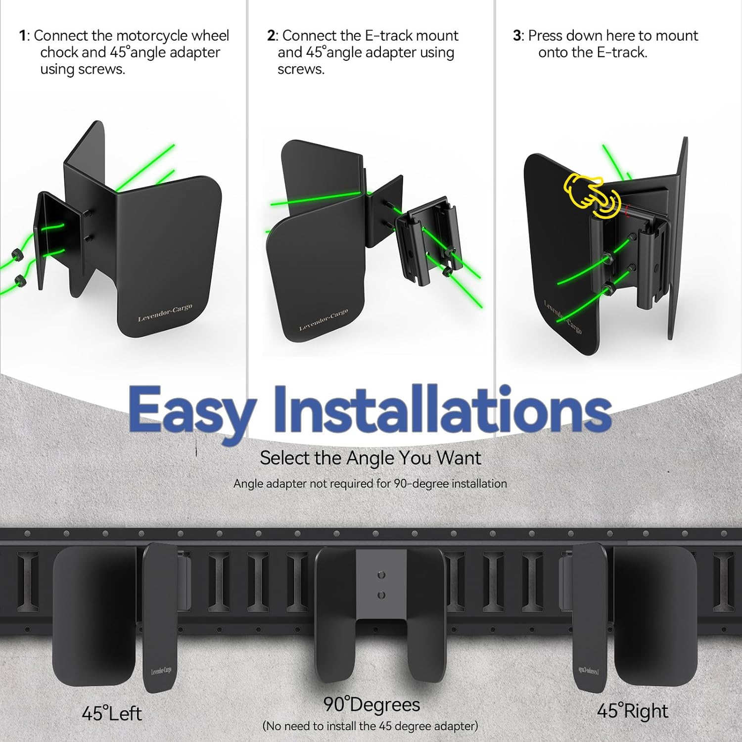 - Three Angles : With the 45-degree adapter, E track motorcycle chock can store your motorcycle at three angles (45 degrees left/ 90 degrees/ 45 degrees right) depending on your needs, which is especially useful in places like trailers and trucks where space is tight