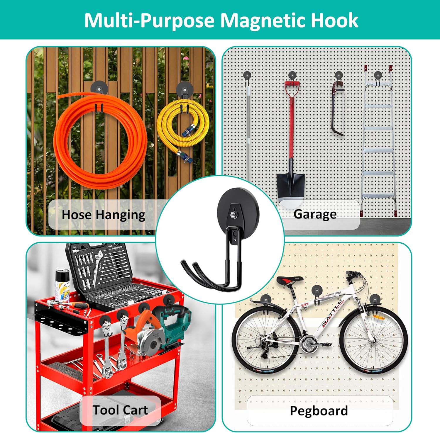 - Magnetic tool holder: The magnetic garage hooks are perfect for storing and hanging power tools, ladders, lawnmowers, garden tools, shovels, brooms, spades, ropes, hoses, bicycles, scooters, etc.