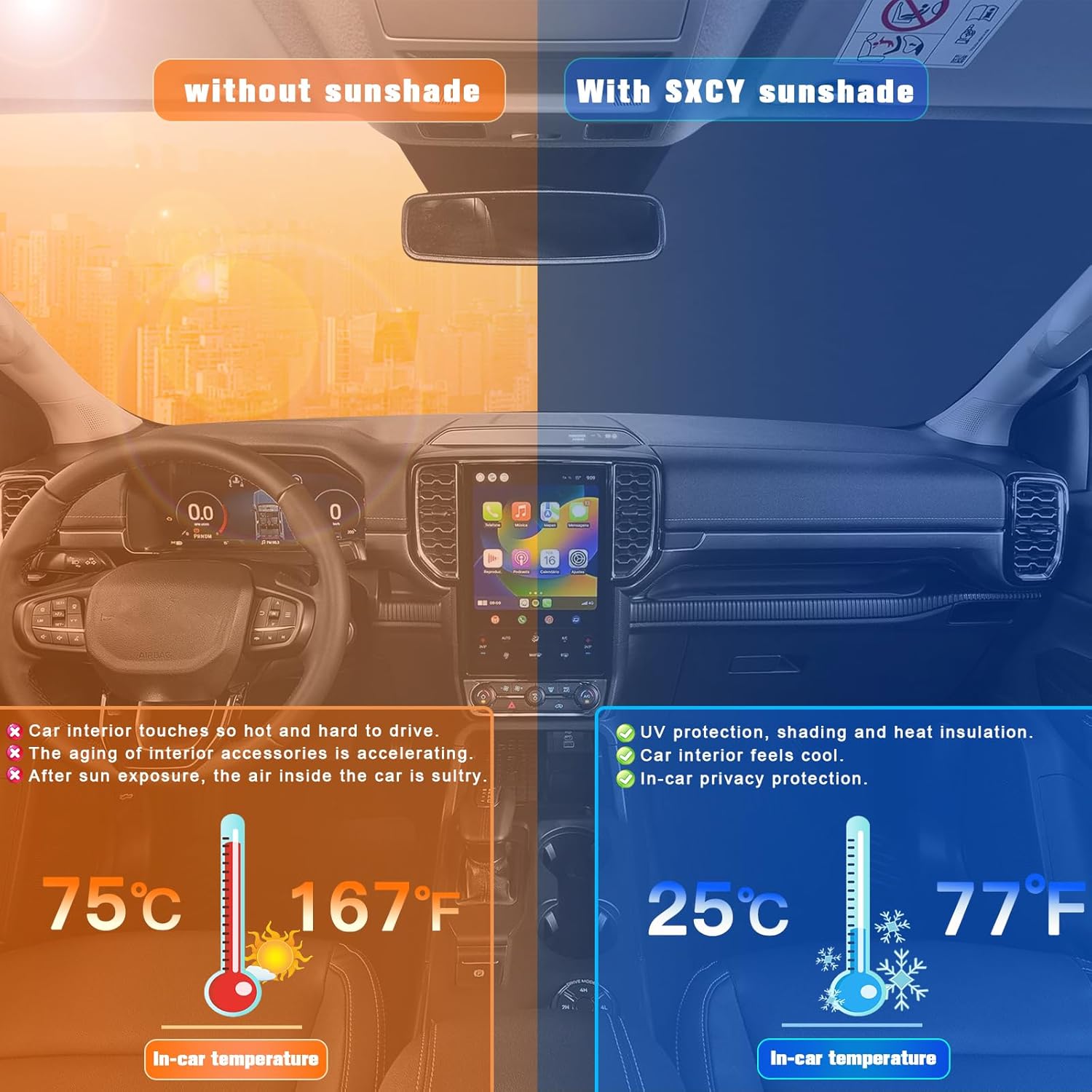 - 2.Sun Protection: Solve your concerns about parking for a long time under the scorching sun,prevent the car's interior from getting sunburned and extend your car interior accessories’life.