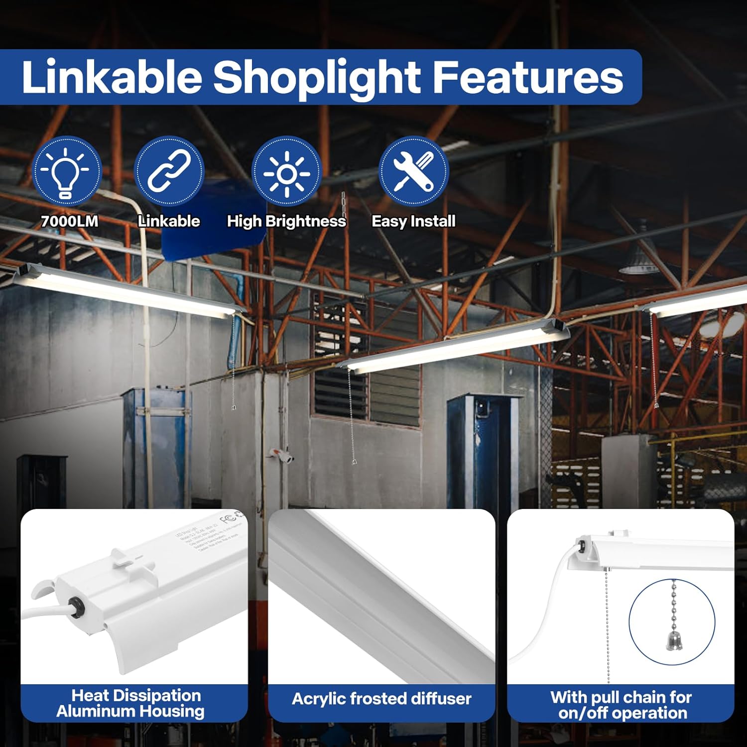 4-Pack 4ft Linkable Led Shop Light, Plug in Garage Lighting with Power Cord and Pull Chain, 7000lm Garage Ceiling Lights, Workshop Led Hanging Lights for Basements, Warehouses, ETL Listed