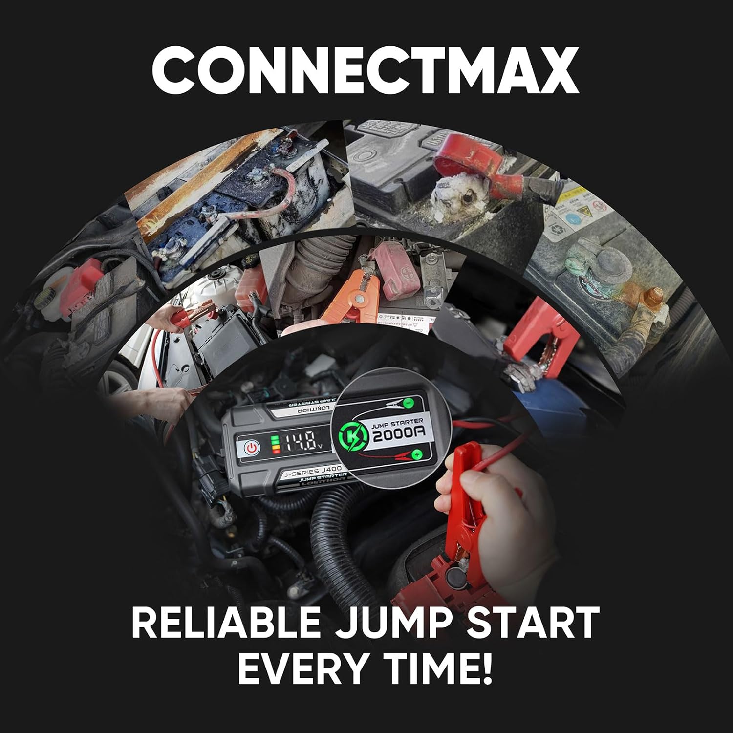 - CONNECTMAX TECHNOLOGY - Experience seamless jump starting efficiency: To ensure optimal connect every time and maximize the starting efficiency of your jump starter, our cutting-edge system automatically detects the impedance of the clamp connection to the car battery.