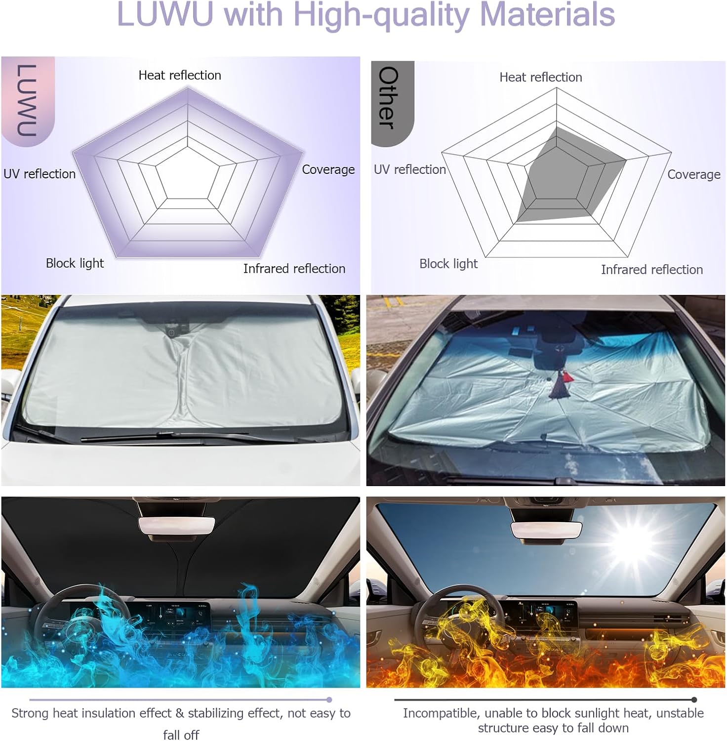 - 【Premium Protection】The windshield sunshade keeps your car internal relatively cool, effectively blocks sunlight, prevents harmful UV rays and heat from entering the car, and does not expose the steering wheel to strong sunlight for a long time, which can burn your hands. It can also protect car leather seats, instrument panels, display electronics, air outlets, etc. make them will not fade, crack, or fail