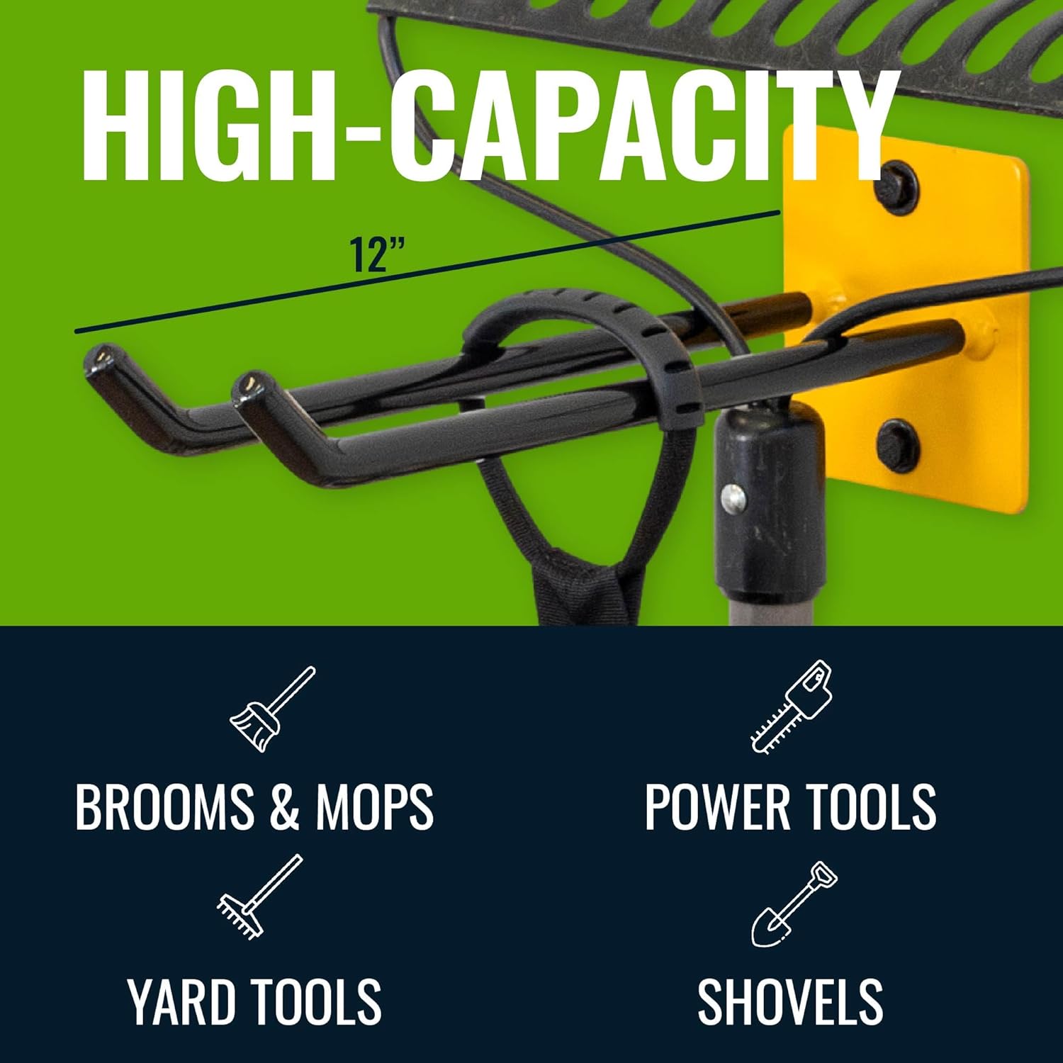 - Garage Wall Hanging Hooks β Universal wall mount storage hook measures 12.3"W x 4.5"D x 4"H to hold shovels, rakes, brooms, mops, garden hoses, extension cords, weed eaters, and much more.