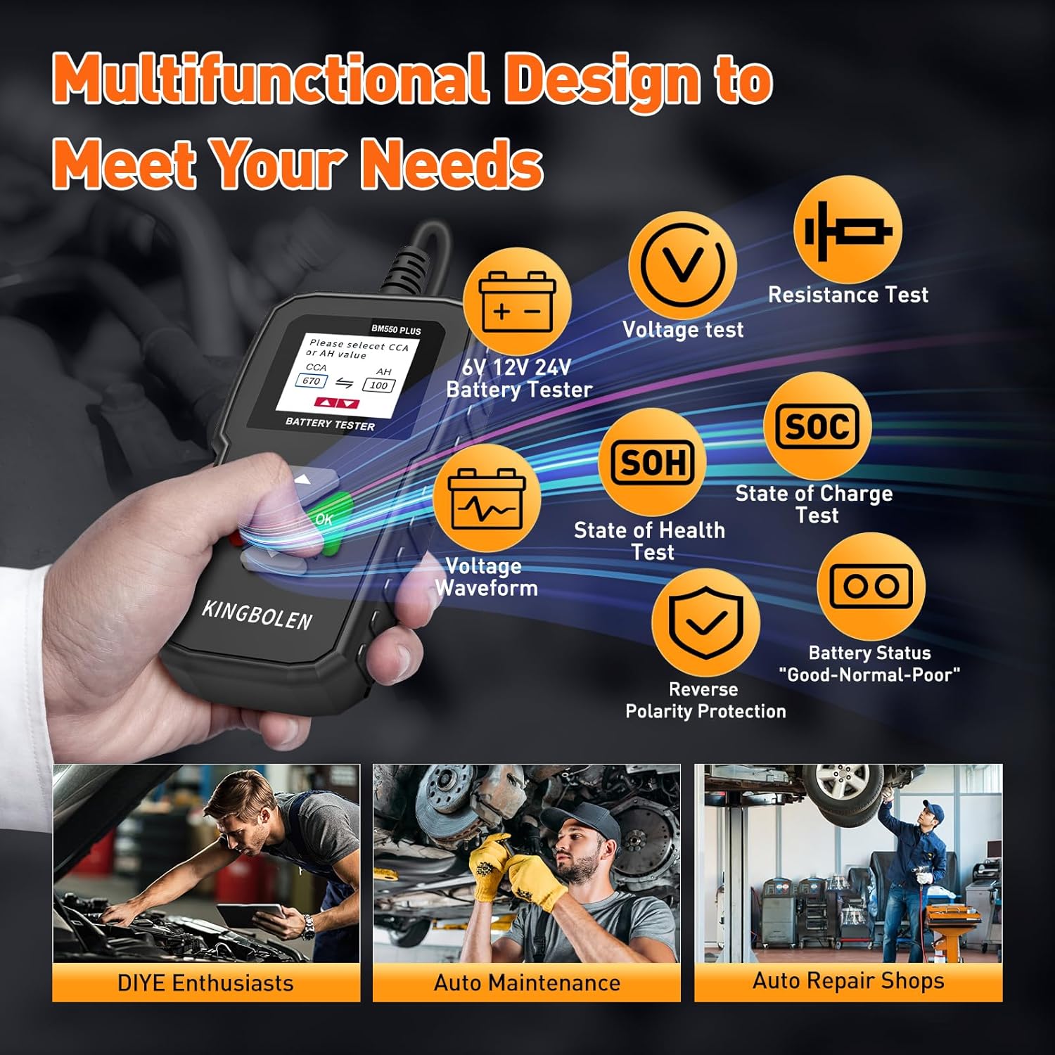 KINGBOLEN BM550 Plus 6V-24V 100-2000 CCA Car Battery Tester, Voltage Waveform Analyzer for Cars Trucks SUV Motorcycle