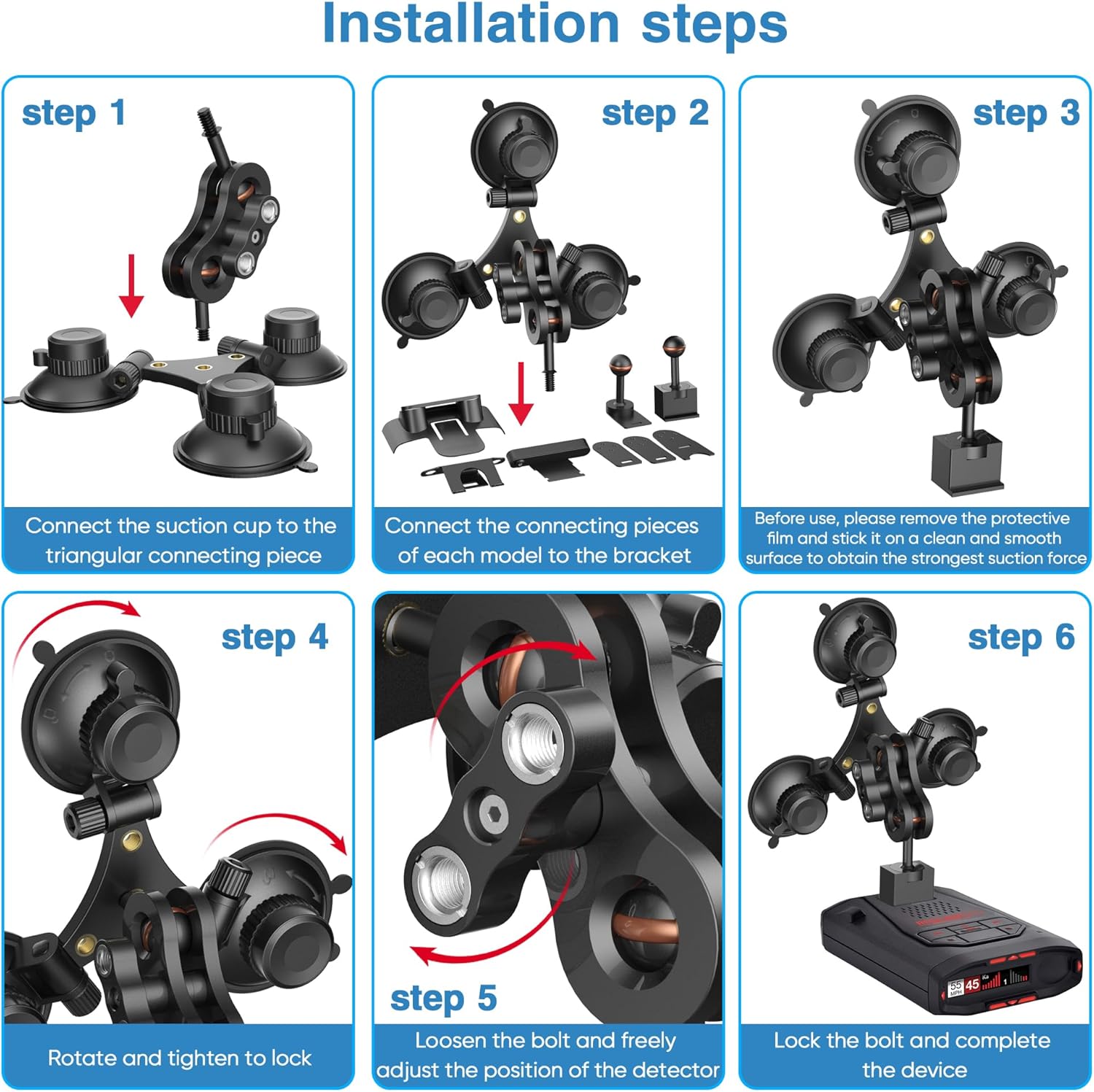- HIGH QUALITY BRACKET Say goodbye to plastic brackets that are prone to falling off when exposed to high temperatures. Our triangular suction cup car mounted radar bracket is made of all aluminum alloy and has undergone anodizing treatment to improve corrosion resistance and wear resistance. No matter on rugged mountain roads, deceleration slopes, or sudden braking, there will be no shaking during driving, ensuring safety and stability without worrying about falling off