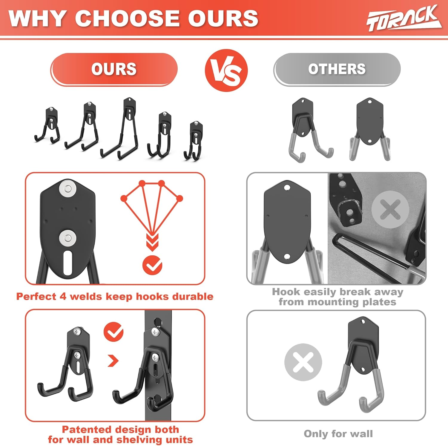 - Simple Installation - These garage wall hooks can be easily mounted on walls or keyhole shelving units. With vertical screw holes for attachment to wall studs and compatibility with 1.5" spaced keyhole slots in shelving unit legs, no special tools or hardware are needed. Just screw them in place and organize your space effortlessly.