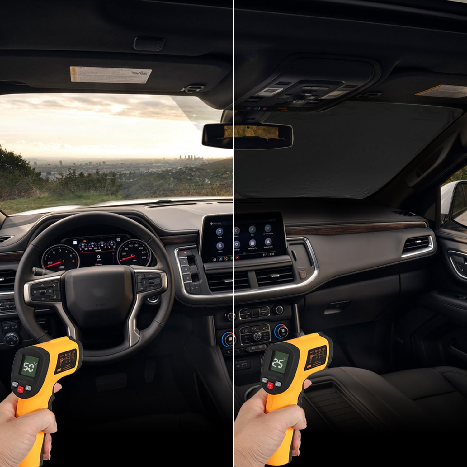 - Van Sun Visor Protector: This Van sunshade is especially fit the windshield sun visor of Tahoe 2025 2024 2023 2022 2021, Yukon 2024 2023 2022 2021 Window. Sunshade prevents over heat penetration causing damage to your steering wheel, windshield dashboard, interior and your car seat.