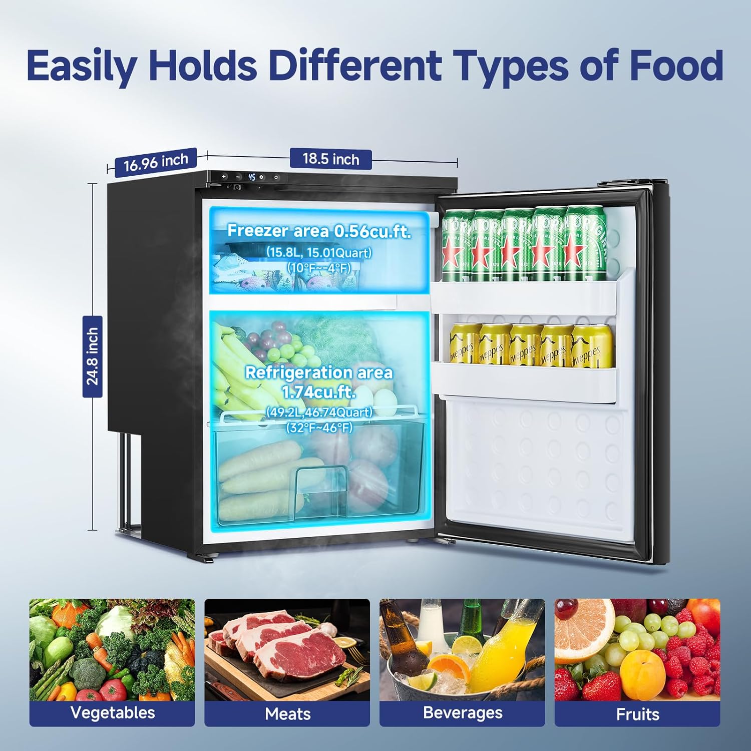 - Professional & Powerful Compressor: BODEGA RV Mini Refrigerator can be a fridge (49.2L) and freezer (15.8L) simultaneously! It can chill down to 4°F using powerful compressor cooling technology, from refrigeration to freezing. Adjust the freezing or refrigeration range of the car refrigerator from -4℉ to 46℉ as needed. This portable refrigerator and freezer is a good choices for outdoor activities such as camping, picnics, road trips, and more. RV refrigerator to accompany you on your journey