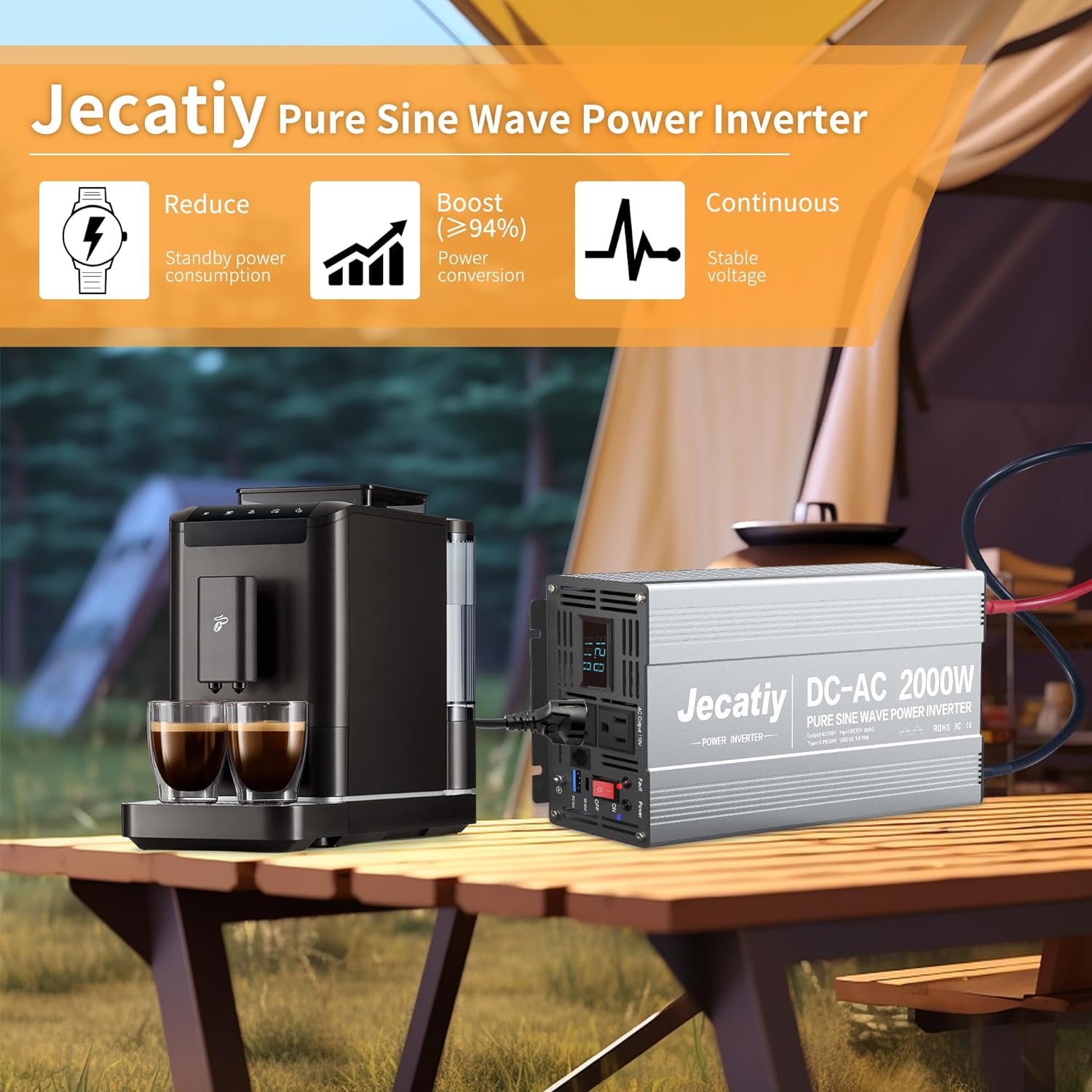 - ă2000W Pure Sine Wave InverterăJecatiy upgrade fully 2000W Power Inverter provides a continuous PURE SINE WAVE power of 2000W, with a peak surge of 4000W during load start-up. Tip: It can handle most appliances for you (including refrigerators, microwaves, or some power tools), as well as low-power devices. Note: The voltage of 110V is the actual display, and 100-120V is the supported range of the application