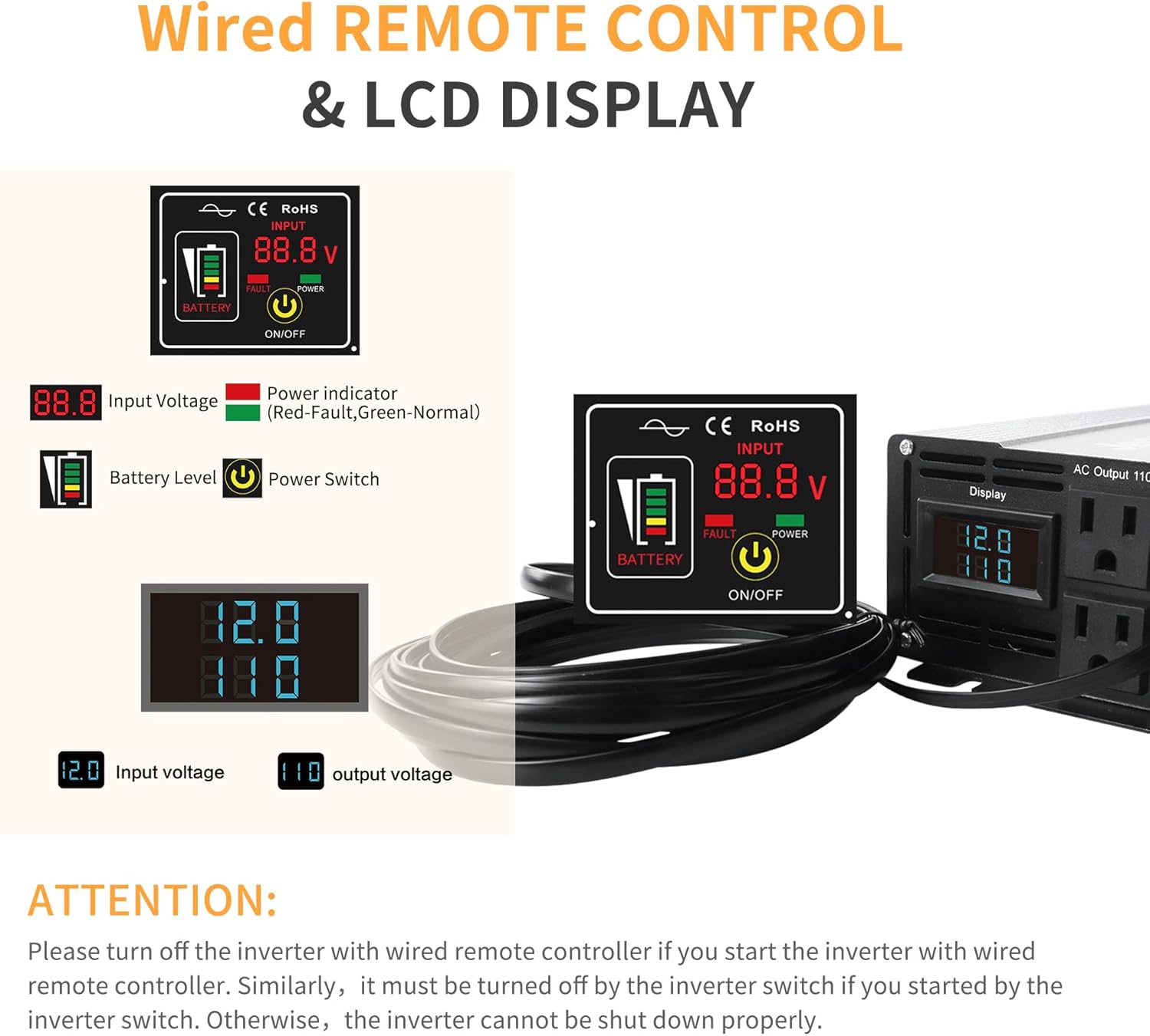 - 【LCD Display & Wired Remote Control】 The 12V power inverter displays real-time input and output voltage, providing clearer and more important usage status information (battery voltage and output power). A wired remote control is more convenient to operate a pure sine wave inverter
